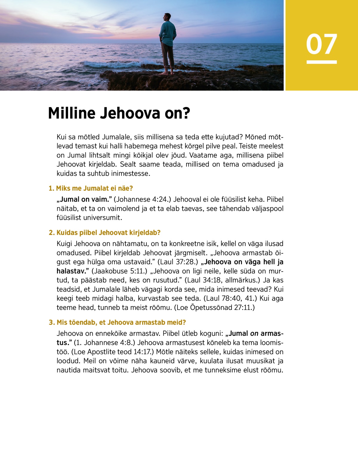 Kui sa mõtled Jumalale, siis millisena sa teda ette kujutad? Mõned mõtlevad temast kui halli habemega mehest kõrgel pilve peal. Teiste meelest on Jumal lihtsalt mingi kõikjal olev jõud. Vaatame aga, millisena piibel Jehoovat kirjeldab. Sealt saame teada, millised on tema omadused ja kuidas ta suhtub inimestesse.