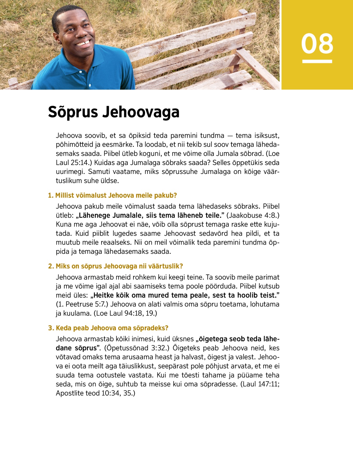 Jehoova soovib, et sa õpiksid teda paremini tundma – tema isiksust, põhimõtteid ja eesmärke. Ta loodab, et nii tekib sul soov temaga lähedasemaks saada. Piibel ütleb koguni, et me võime olla Jumala sõbrad. (Loe Laul 25:14.) Kuidas aga Jumalaga sõbraks saada? Selles õppetükis seda uurimegi. Samuti vaatame, miks sõprussuhe Jumalaga on kõige väärtuslikum suhe üldse.