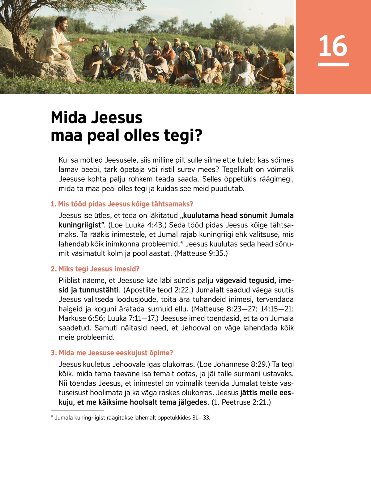 Kui sa mõtled Jeesusele, siis milline pilt sulle silme ette tuleb: kas sõimes lamav beebi, tark õpetaja või ristil surev mees? Tegelikult on võimalik Jeesuse kohta palju rohkem teada saada. Selles õppetükis räägimegi, mida ta maa peal olles tegi ja kuidas see meid puudutab.