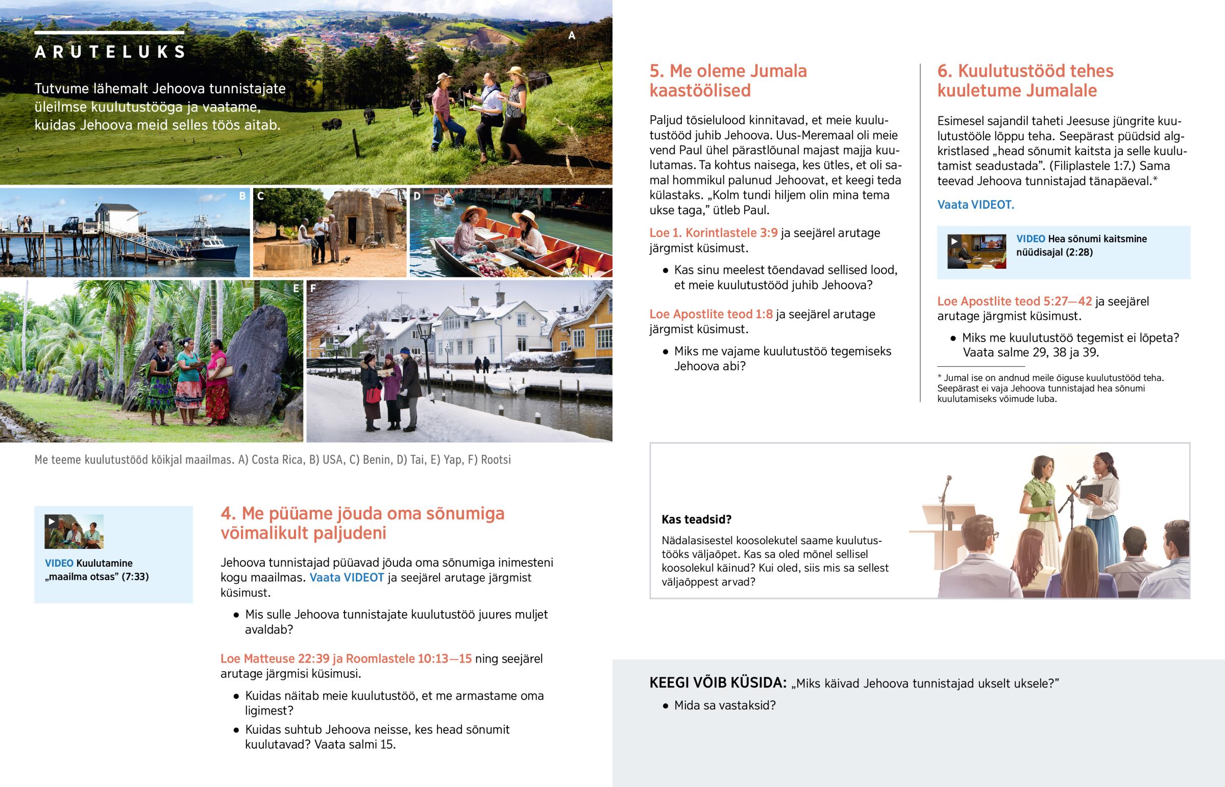 A. Kaks Jehoova tunnistajat kuulutavad haljendaval Costa Rica mäenõlval ühele mehele. B. Kaks paari Jehoova tunnistajaid kuulutavad ühes USA sadamas kalameestele. C. Kaks Jehoova tunnistajat kuulutavad Benini külakeses ühele mehele. D. Jehoova tunnistajast naine kuulutab Tai ujuval turul ühele müüjannale E. Kaks Jehoova tunnistajat kuulutavad ühele naisele Yapil suure kiviketta ees.. F. Kaks Jehoova tunnistajat kuulutavad Rootsis kanaliäärsel lumisel kõnniteel ühele naisele..