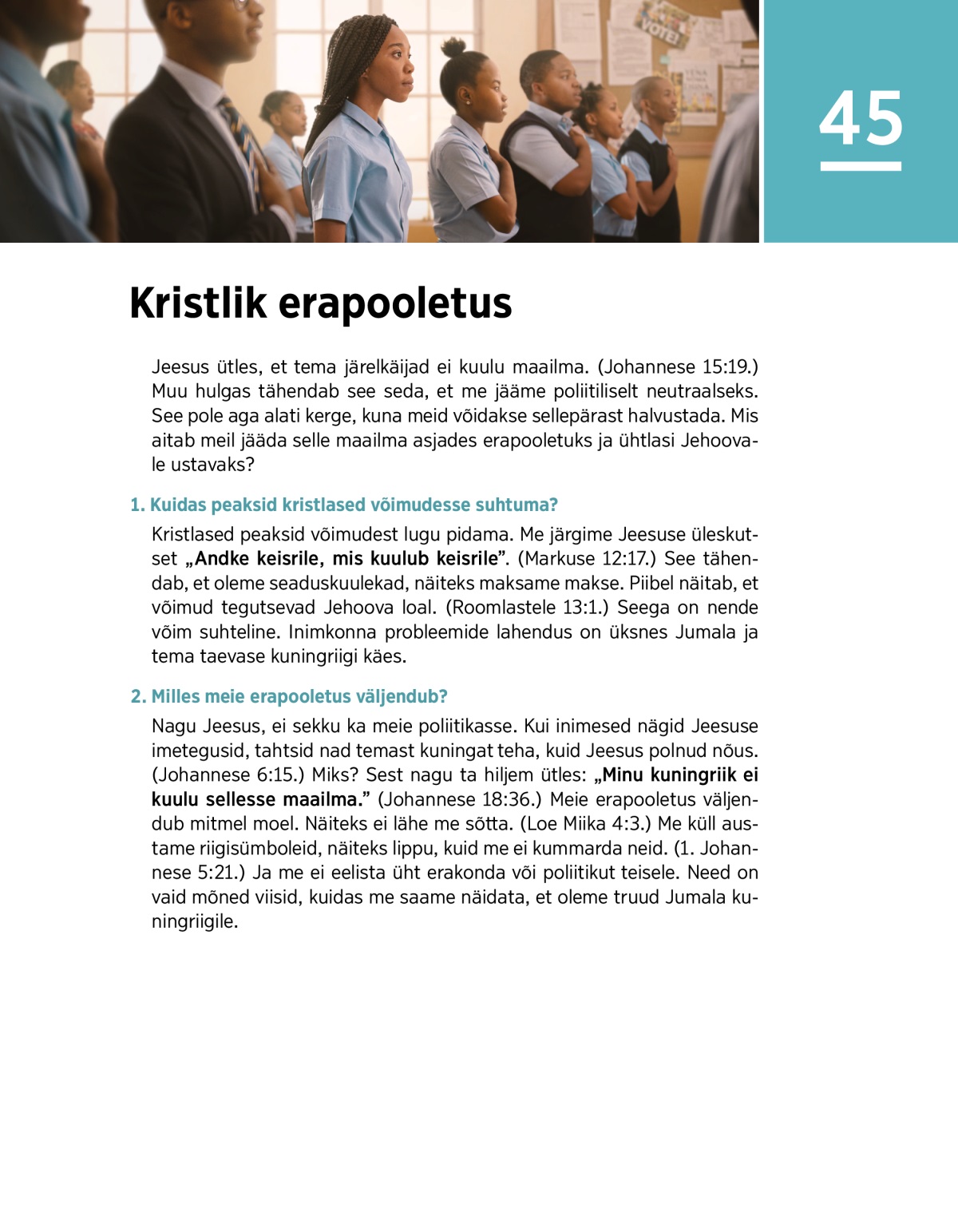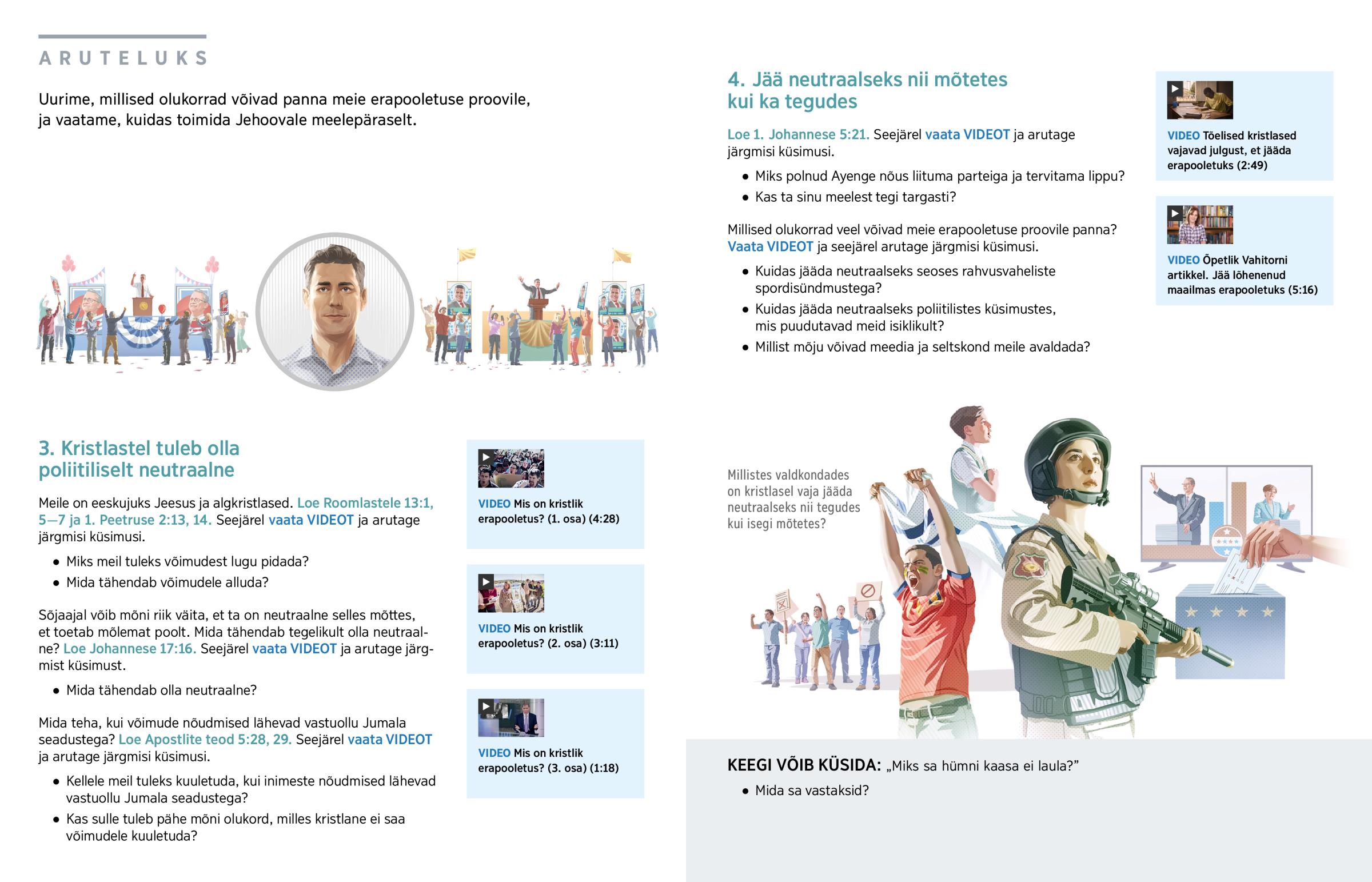 Nagu Jeesus, ei sekku ka meie poliitikasse. Kui inimesed nägid Jeesuse imetegusid, tahtsid nad temast kuningat teha, kuid Jeesus polnud nõus. (Johannese 6:15.) Miks? Sest nagu ta hiljem ütles: „Minu kuningriik ei kuulu sellesse maailma.” (Johannese 18:36.) Meie erapooletus väljendub mitmel moel. Näiteks ei lähe me sõtta. (Loe Miika 4:3.) Me küll austame riigisümboleid, näiteks lippu, kuid me ei kummarda neid. (1. Johannese 5:21.) Ja me ei eelista üht erakonda või poliitikut teisele. Need on vaid mõned viisid, kuidas me saame näidata, et oleme truud Jumala kuningriigile.
