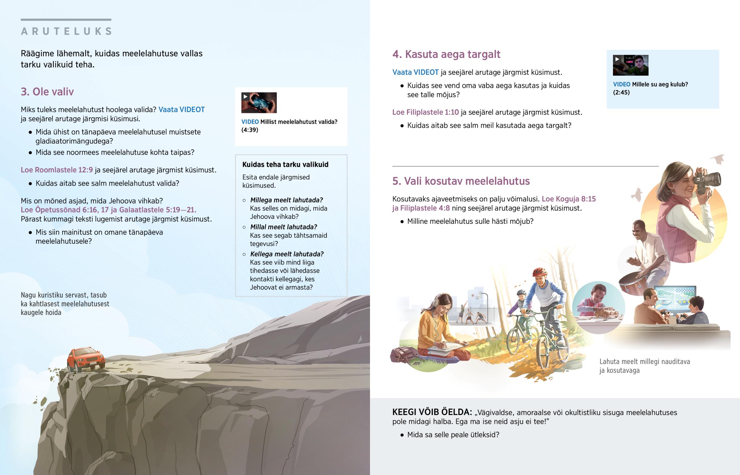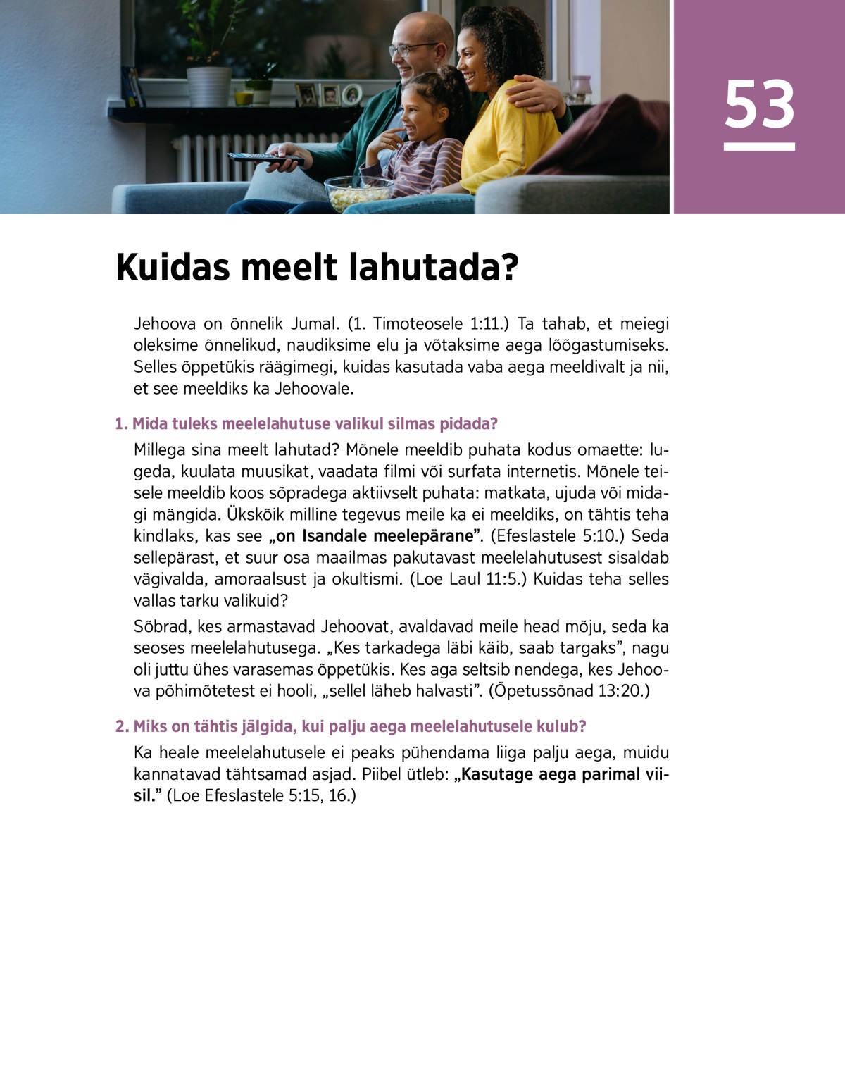Millega sina meelt lahutad? Mõnele meeldib puhata kodus omaette: lugeda, kuulata muusikat, vaadata filmi või surfata internetis. Mõnele teisele meeldib koos sõpradega aktiivselt puhata: matkata, ujuda või midagi mängida. Ükskõik milline tegevus meile ka ei meeldiks, on tähtis teha kindlaks, kas see „on Isandale meelepärane”. (Efeslastele 5:10.) Seda sellepärast, et suur osa maailmas pakutavast meelelahutusest sisaldab vägivalda, amoraalsust ja okultismi. (Loe Laul 11:5.) Kuidas teha selles vallas tarku valikuid?