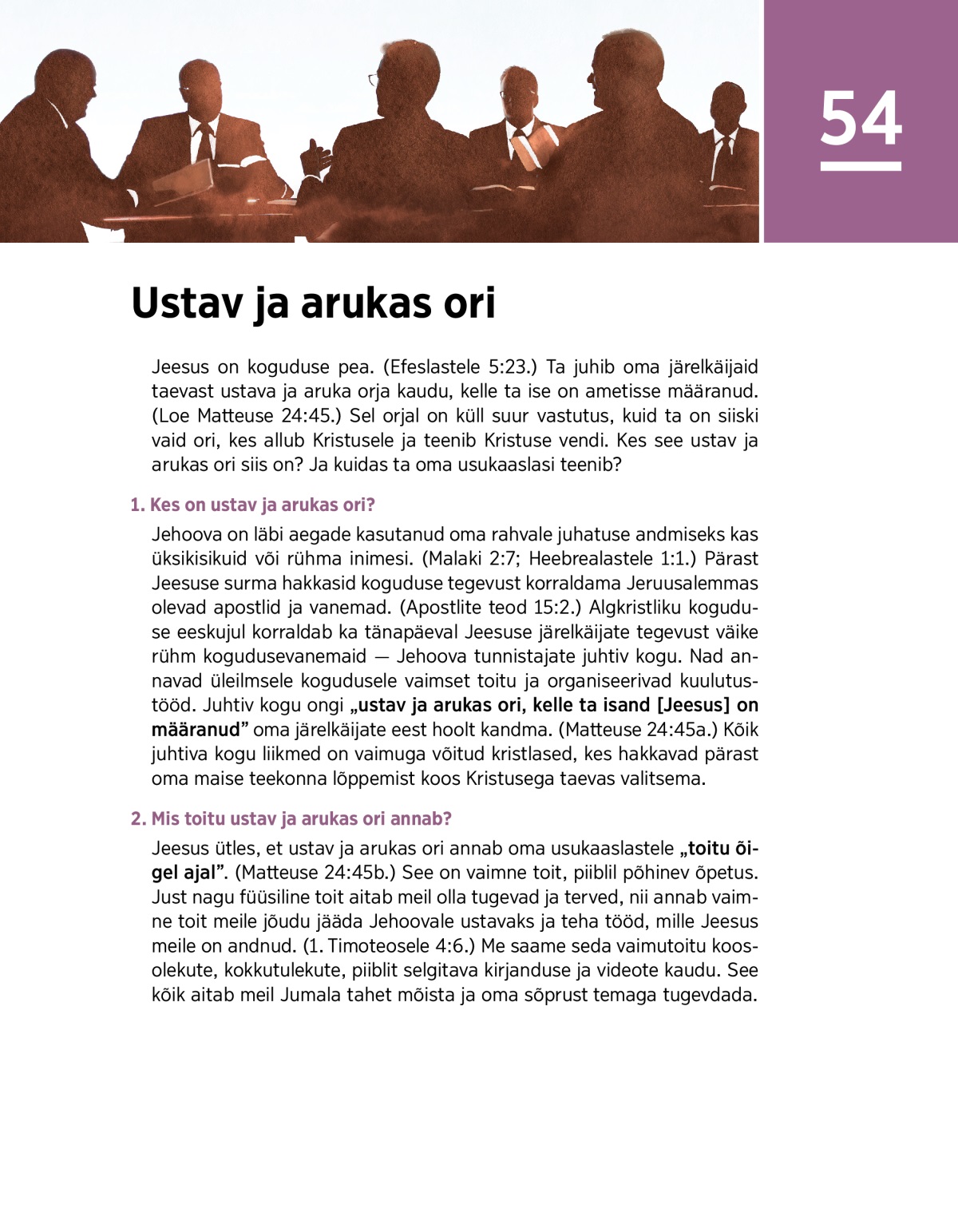 Jehoova on läbi aegade kasutanud oma rahvale juhatuse andmiseks kas üksikisikuid või rühma inimesi. (Malaki 2:7; Heebrealastele 1:1.) Pärast Jeesuse surma hakkasid koguduse tegevust korraldama Jeruusalemmas olevad apostlid ja vanemad. (Apostlite teod 15:2.) Algkristliku koguduse eeskujul korraldab ka tänapäeval Jeesuse järelkäijate tegevust väike rühm kogudusevanemaid – Jehoova tunnistajate juhtiv kogu. Nad annavad üleilmsele kogudusele vaimset toitu ja organiseerivad kuulutustööd. Juhtiv kogu ongi „ustav ja arukas ori, kelle ta isand [Jeesus] on määranud” oma järelkäijate eest hoolt kandma. (Matteuse 24:45a.) Kõik juhtiva kogu liikmed on vaimuga võitud kristlased, kes hakkavad pärast oma maise teekonna lõppemist koos Kristusega taevas valitsema.