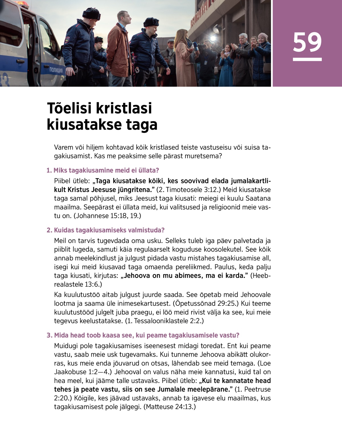 Piibel ütleb: „Taga kiusatakse kõiki, kes soovivad elada jumalakartlikult Kristus Jeesuse jüngritena.” (2. Timoteosele 3:12.) Meid kiusatakse taga samal põhjusel, miks Jeesust taga kiusati: meiegi ei kuulu Saatana maailma. Seepärast ei üllata meid, kui valitsused ja religioonid meie vastu on. (Johannese 15:18, 19.)