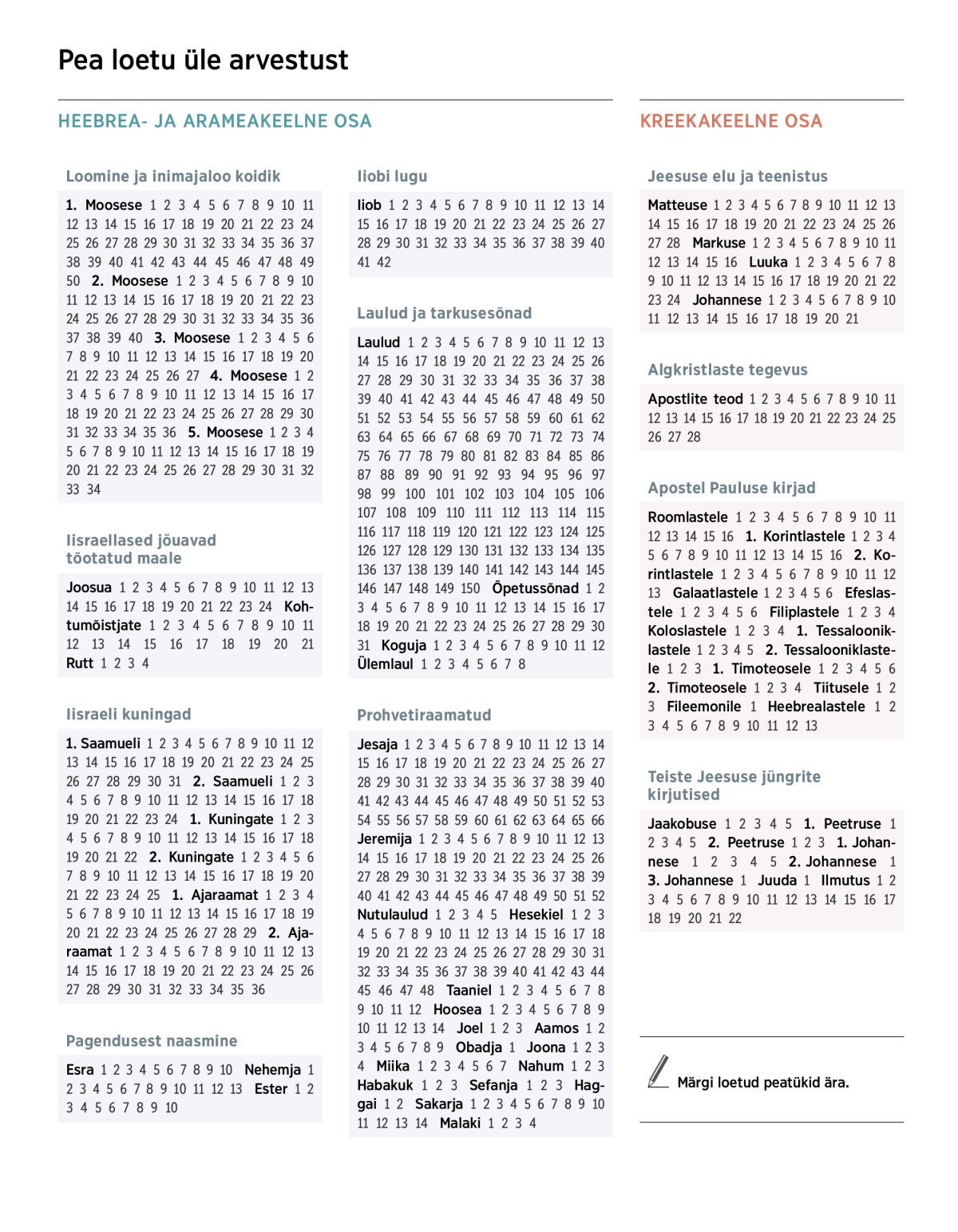 Pea loetu üle arvestust Trükiväljaanne Loomine ja inimajaloo koidik Iisraellased jõuavad tõotatud maale Iisraeli kuningad Pagendusest naasmine Iiobi lugu Laulud ja tarkusesõnad Prohvetiraamatud Jeesuse elu ja teenistus Algkristlaste tegevus Apostel Pauluse kirjad Teiste Jeesuse jüngrite kirjutised Märgi loetud peatükid ära. HEEBREA- JA ARAMEAKEELNE OSA Loomine ja inimajaloo koidik 1. Moosese 1 2 3 4 5 6 7 8 9 10 11 12 13 14 15 16 17 18 19 20 21 22 23 24 25 26 27 28 29 30 31 32 33 34 35 36 37 38 39 40 41 42 43 44 45 46 47 48 49 50 2. Moosese 1 2 3 4 5 6 7 8 9 10 11 12 13 14 15 16 17 18 19 20 21 22 23 24 25 26 27 28 29 30 31 32 33 34 35 36 37 38 39 40 3. Moosese 1 2 3 4 5 6 7 8 9 10 11 12 13 14 15 16 17 18 19 20 21 22 23 24 25 26 27 4. Moosese 1 2 3 4 5 6 7 8 9 10 11 12 13 14 15 16 17 18 19 20 21 22 23 24 25 26 27 28 29 30 31 32 33 34 35 36 5. Moosese 1 2 3 4 5 6 7 8 9 10 11 12 13 14 15 16 17 18 19 20 21 22 23 24 25 26 27 28 29 30 31 32 33 34 Iisraellased jõuavad tõotatud maale Joosua 1 2 3 4 5 6 7 8 9 10 11 12 13 14 15 16 17 18 19 20 21 22 23 24 Kohtumõistjate 1 2 3 4 5 6 7 8 9 10 11 12 13 14 15 16 17 18 19 20 21 Rutt 1 2 3 4 Iisraeli kuningad 1. Saamueli 1 2 3 4 5 6 7 8 9 10 11 12 13 14 15 16 17 18 19 20 21 22 23 24 25 26 27 28 29 30 31 2. Saamueli 1 2 3 4 5 6 7 8 9 10 11 12 13 14 15 16 17 18 19 20 21 22 23 24 1. Kuningate 1 2 3 4 5 6 7 8 9 10 11 12 13 14 15 16 17 18 19 20 21 22 2. Kuningate 1 2 3 4 5 6 7 8 9 10 11 12 13 14 15 16 17 18 19 20 21 22 23 24 25 1. Ajaraamat 1 2 3 4 5 6 7 8 9 10 11 12 13 14 15 16 17 18 19 20 21 22 23 24 25 26 27 28 29 2. Ajaraamat 1 2 3 4 5 6 7 8 9 10 11 12 13 14 15 16 17 18 19 20 21 22 23 24 25 26 27 28 29 30 31 32 33 34 35 36 Pagendusest naasmine Esra 1 2 3 4 5 6 7 8 9 10 Nehemja 1 2 3 4 5 6 7 8 9 10 11 12 13 Ester 1 2 3 4 5 6 7 8 9 10 Iiobi lugu Iiob 1 2 3 4 5 6 7 8 9 10 11 12 13 14 15 16 17 18 19 20 21 22 23 24 25 26 27 28 29 30 31 32 33 34 35 36 37 38 39 40 41 42 Laulud ja tarkusesõnad Laulud 1 2 3 4 5 6 7 8 9 10 11 12 13 14 15 16 17 18 19 20 21 22 23 24 25 26 27 28 29 30 31 32 33 34 35 36 37 38 39 40 41 42 43 44 45 46 47 48 49 50 51 52 53 54 55 56 57 58 59 60 61 62 63 64 65 66 67 68 69 70 71 72 73 74 75 76 77 78 79 80 81 82 83 84 85 86 87 88 89 90 91 92 93 94 95 96 97 98 99 100 101 102 103 104 105 106 107 108 109 110 111 112 113 114 115 116 117 118 119 120 121 122 123 124 125 126 127 128 129 130 131 132 133 134 135 136 137 138 139 140 141 142 143 144 145 146 147 148 149 150 Õpetussõnad 1 2 3 4 5 6 7 8 9 10 11 12 13 14 15 16 17 18 19 20 21 22 23 24 25 26 27 28 29 30 31 Koguja 1 2 3 4 5 6 7 8 9 10 11 12 Ülemlaul 1 2 3 4 5 6 7 8 Prohvetiraamatud Jesaja 1 2 3 4 5 6 7 8 9 10 11 12 13 14 15 16 17 18 19 20 21 22 23 24 25 26 27 28 29 30 31 32 33 34 35 36 37 38 39 40 41 42 43 44 45 46 47 48 49 50 51 52 53 54 55 56 57 58 59 60 61 62 63 64 65 66 Jeremija 1 2 3 4 5 6 7 8 9 10 11 12 13 14 15 16 17 18 19 20 21 22 23 24 25 26 27 28 29 30 31 32 33 34 35 36 37 38 39 40 41 42 43 44 45 46 47 48 49 50 51 52 Nutulaulud 1 2 3 4 5 Hesekiel 1 2 3 4 5 6 7 8 9 10 11 12 13 14 15 16 17 18 19 20 21 22 23 24 25 26 27 28 29 30 31 32 33 34 35 36 37 38 39 40 41 42 43 44 45 46 47 48 Taaniel 1 2 3 4 5 6 7 8 9 10 11 12 Hoosea 1 2 3 4 5 6 7 8 9 10 11 12 13 14 Joel 1 2 3 Aamos 1 2 3 4 5 6 7 8 9 Obadja 1 Joona 1 2 3 4 Miika 1 2 3 4 5 6 7 Nahum 1 2 3 Habakuk 1 2 3 Sefanja 1 2 3 Haggai 1 2 Sakarja 1 2 3 4 5 6 7 8 9 10 11 12 13 14 Malaki 1 2 3 4 KREEKAKEELNE OSA Jeesuse elu ja teenistus Matteuse 1 2 3 4 5 6 7 8 9 10 11 12 13 14 15 16 17 18 19 20 21 22 23 24 25 26 27 28 Markuse 1 2 3 4 5 6 7 8 9 10 11 12 13 14 15 16 Luuka 1 2 3 4 5 6 7 8 9 10 11 12 13 14 15 16 17 18 19 20 21 22 23 24 Johannese 1 2 3 4 5 6 7 8 9 10 11 12 13 14 15 16 17 18 19 20 21 Algkristlaste tegevus Apostlite teod 1 2 3 4 5 6 7 8 9 10 11 12 13 14 15 16 17 18 19 20 21 22 23 24 25 26 27 28 Apostel Pauluse kirjad Roomlastele 1 2 3 4 5 6 7 8 9 10 11 12 13 14 15 16 1. Korintlastele 1 2 3 4 5 6 7 8 9 10 11 12 13 14 15 16 2. Korintlastele 1 2 3 4 5 6 7 8 9 10 11 12 13 Galaatlastele 1 2 3 4 5 6 Efeslastele 1 2 3 4 5 6 Filiplastele 1 2 3 4 Koloslastele 1 2 3 4 1. Tessalooniklastele 1 2 3 4 5 2. Tessalooniklastele 1 2 3 1. Timoteosele 1 2 3 4 5 6 2. Timoteosele 1 2 3 4 Tiitusele 1 2 3 Fileemonile 1 Heebrealastele 1 2 3 4 5 6 7 8 9 10 11 12 13 Teiste Jeesuse jüngrite kirjutised Jaakobuse 1 2 3 4 5 1. Peetruse 1 2 3 4 5 2. Peetruse 1 2 3 1. Johannese 1 2 3 4 5 2. Johannese 1 3. Johannese 1 Juuda 1 Ilmutus 1 2 3 4 5 6 7 8 9 10 11 12 13 14 15 16 17 18 19 20 21 22