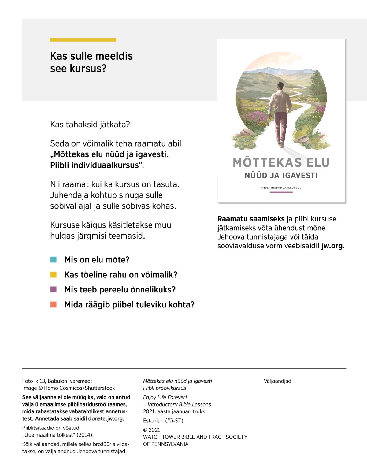 Raamatu saamiseks ja piiblikursuse jätkamiseks võta ühendust mõne Jehoova tunnistajaga või täida sooviavalduse vorm veebisaidil jw.org.