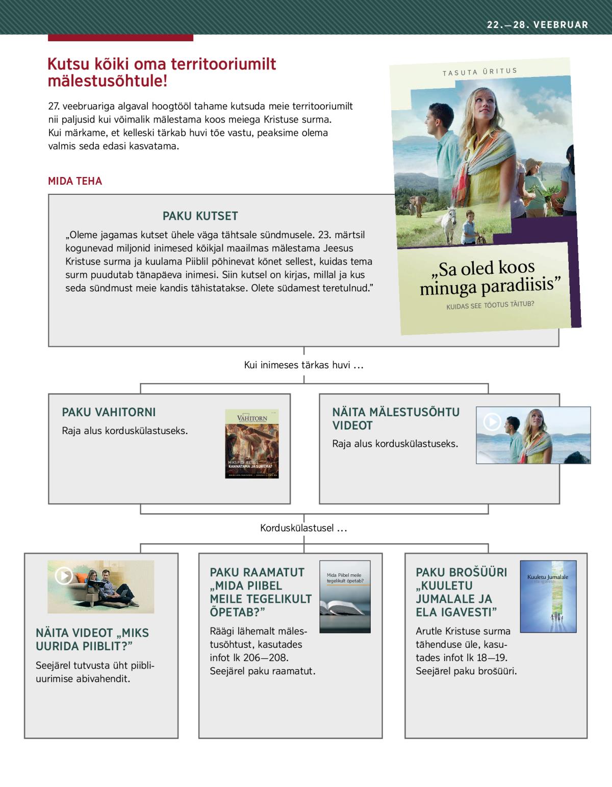 27. veebruariga algaval hoogtööl tahame kutsuda meie territooriumilt nii paljusid kui võimalik mälestama koos meiega Kristuse surma. Kui märkame, et kelleski tärkab huvi tõe vastu, peaksime olema valmis seda edasi kasvatama.