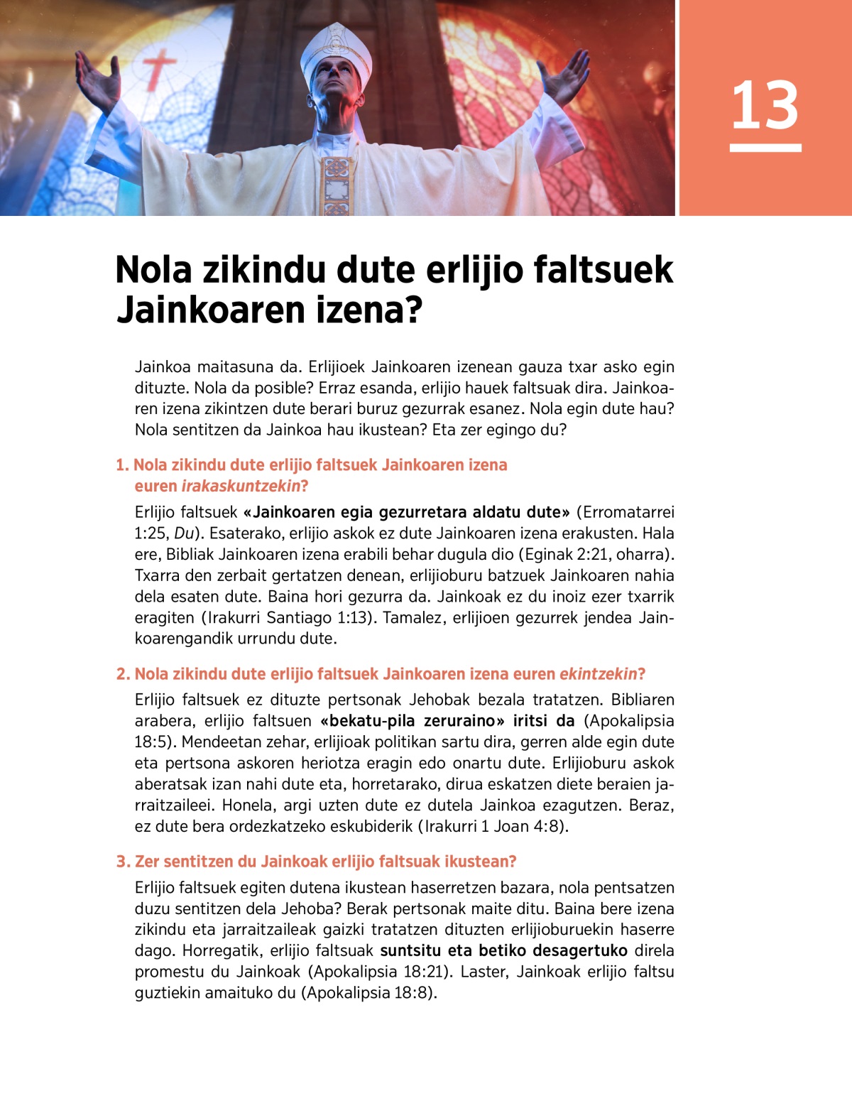 Erlijio faltsuek «Jainkoaren egia gezurretara aldatu dute» (Erromatarrei 1:25, Du). Esaterako, erlijio askok ez dute Jainkoaren izena erakusten. Hala ere, Bibliak Jainkoaren izena erabili behar dugula dio (Eginak 2:21, oharra). Txarra den zerbait gertatzen denean, erlijioburu batzuek Jainkoaren nahia dela esaten dute. Baina hori gezurra da. Jainkoak ez du inoiz ezer txarrik eragiten (Irakurri Santiago 1:13). Tamalez, erlijioen gezurrek jendea Jainkoarengandik urrundu dute.