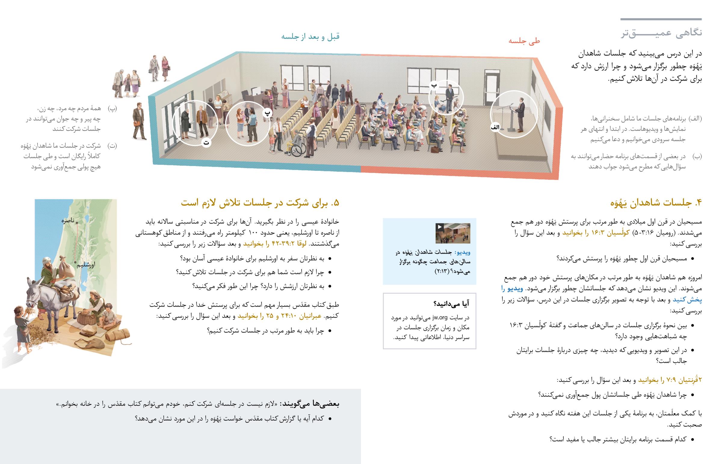 امروزه هم شاهدان یَهُوَه به طور مرتب در مکان‌های پرستش خود دور هم جمع می‌شوند.‏ این ویدیو نشان می‌دهد که جلساتشان چطور برگزار می‌شود.‏ ویدیو را پخش کنید و بعد با توجه به تصویر برگزاری جلسات در این درس،‏ سؤالات زیر را بررسی کنید:‏