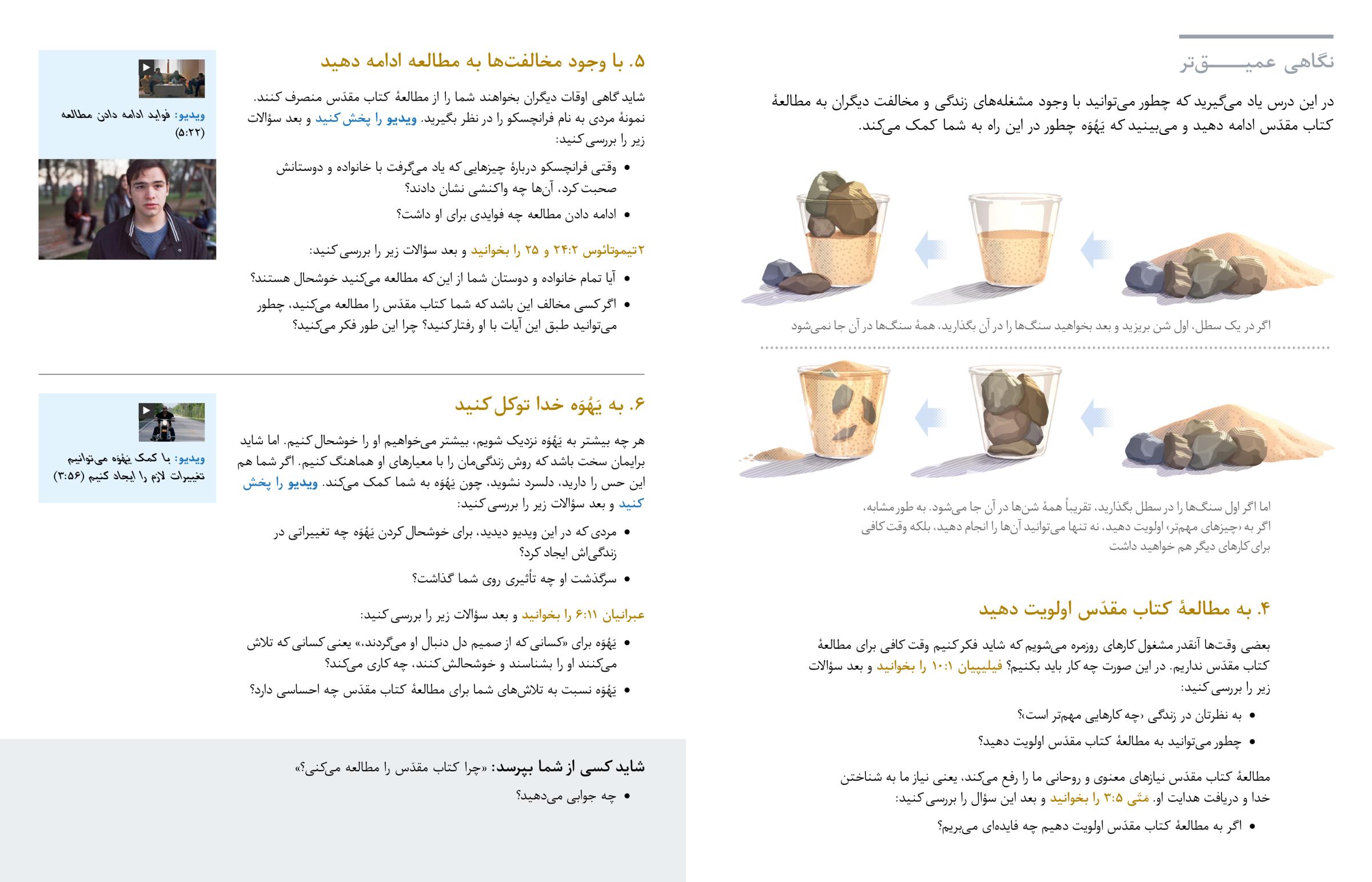 در این درس یاد میگیرید که چطور میتوانید با وجود مشغلههای زندگی و مخالفت دیگران به مطالعهٔ کتاب مقدّس ادامه دهید و میبینید که یَهُوَه چطور در این راه به شما کمک میکند.