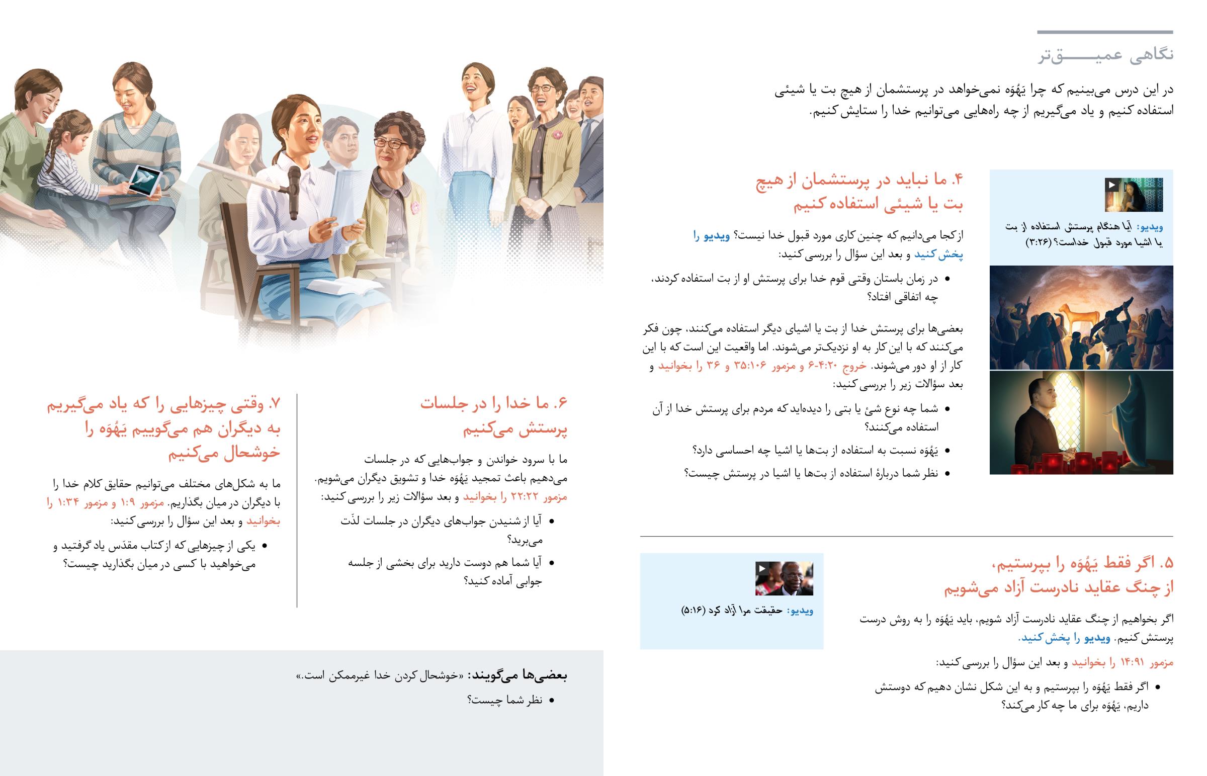 در این درس میبینیم که چرا یَهُوَه نمیخواهد در پرستشمان از هیچ بت یا شیئی استفاده کنیم و یاد میگیریم از چه راههایی میتوانیم خدا را ستایش کنیم.
