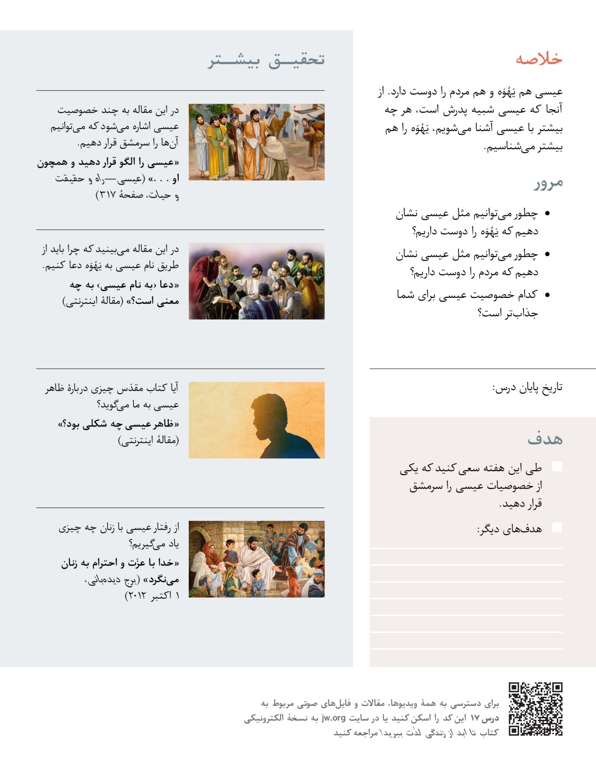 در این درس، با شخصیت عیسی بیشتر آشنا میشویم و میبینیم که چطور میتوانیم مثل او محبت کنیم و سخاوتمند باشیم.