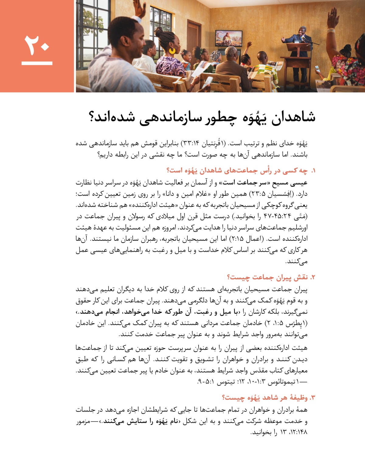در این درس میبینیم که عیسی چطور ما را رهبری میکند و پیران جماعت چطور او را سرمشق قرار میدهند. همین طور یاد میگیریم که چطور میتوانیم با عیسی و پیران جماعت همکاری کنیم.