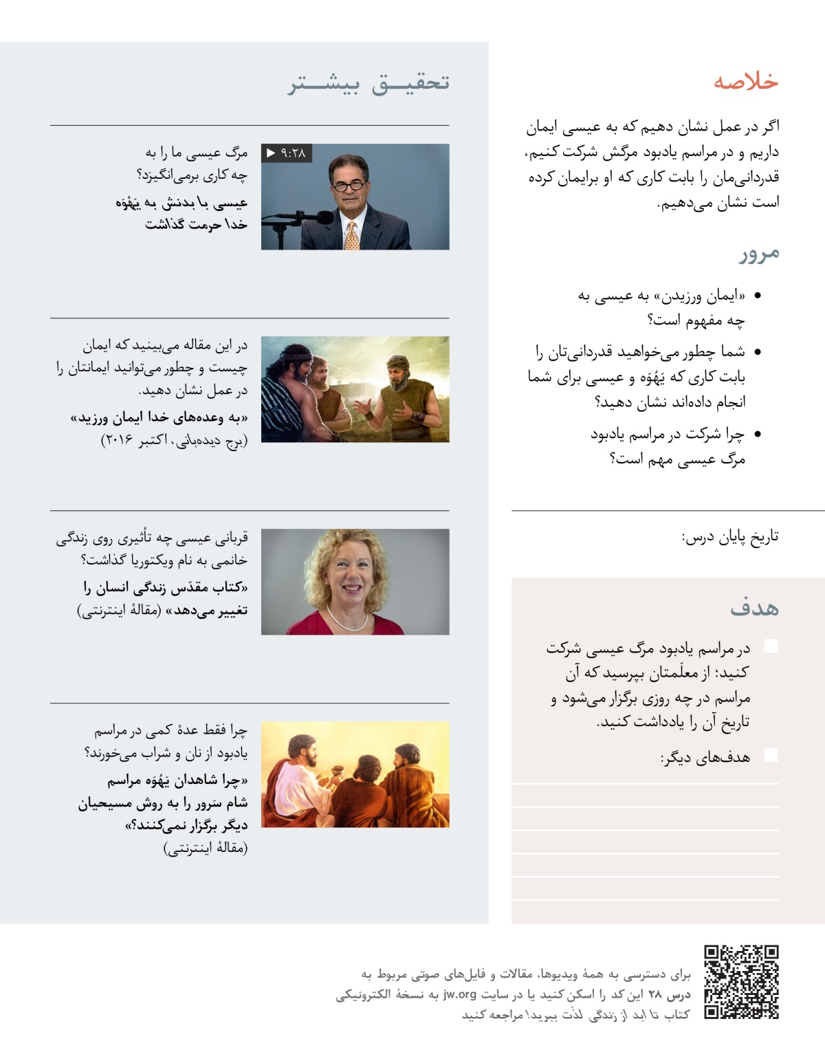 در این درس یاد میگیریم که چطور میتوانیم قدردانیمان را برای محبت بیکران یَهُوَه و عیسی نشان دهیم. همین طور میبینیم که چرا شرکت در مراسم یادبود مرگ مسیح مهم است.