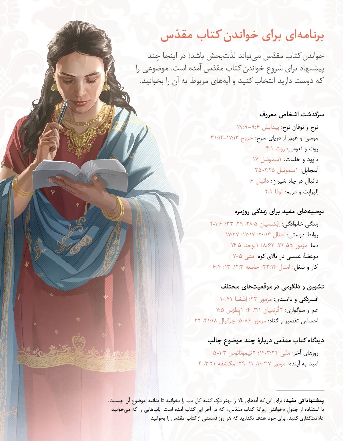 پیشنهاداتی مفید: برای این که آیههای بالا را بهتر درک کنید کل باب را بخوانید تا بدانید موضوع آن چیست. با استفاده از جدولِ «خواندن روزانهٔ کتاب مقدّس» که در آخر این کتاب آمده است، بابهایی را که میخوانید علامتگذاری کنید. برای خود هدف بگذارید که هر روز قسمتی از کتاب مقدّس را بخوانید.