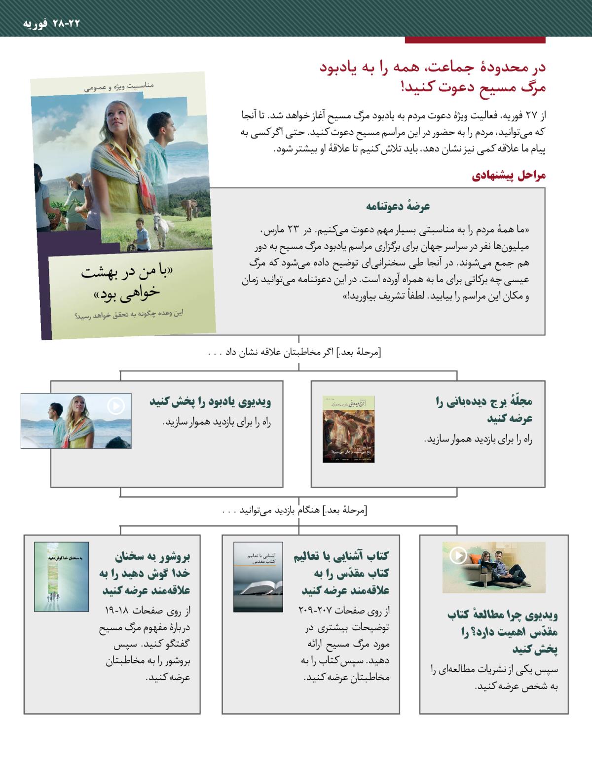 از ۲۷ فوریه، فعالیت ویژهٔ دعوت مردم به یادبود مرگ مسیح آغاز خواهد شد. تا آنجا که میتوانید، مردم را به حضور در این مراسم مسیح دعوت کنید. حتی اگر کسی به پیام ما علاقه کمی نیز نشان دهد، باید تلاش کنیم تا علاقهٔ او بیشتر شود.