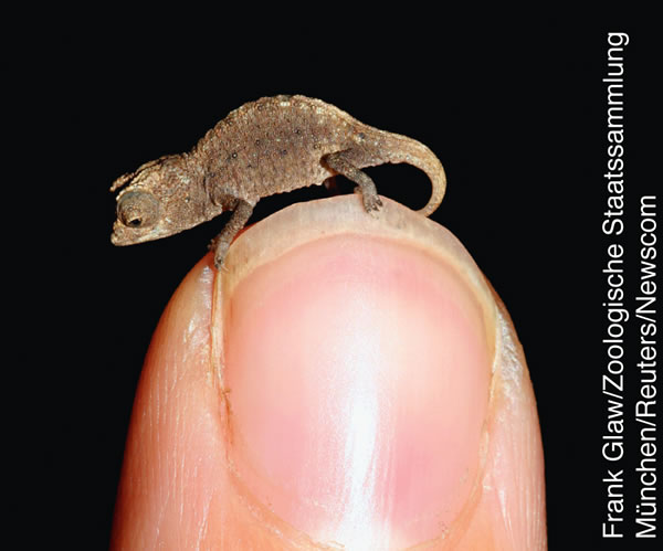Madagaskarista löytyi äskettäin maailman pienin kameleontti. Tämä pikkuruinen ruskea lisko on tuskin kolmen senttimetrin pituinen, ja jotkin yksilöt mahtuvat jopa sormen päähän. Eläintä saattaa elinympäristön häviämisen vuoksi uhata sukupuutto.