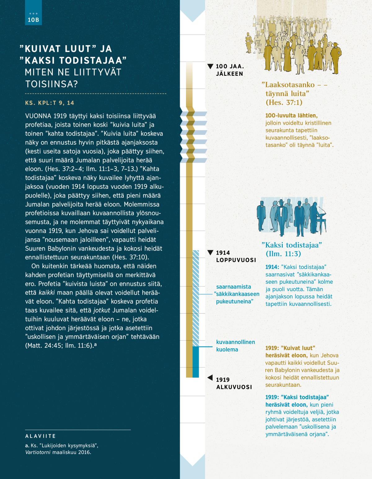 On kuitenkin tärkeää huomata, että näiden kahden profetian täyttymisellä on merkittävä ero. Profetia ”kuivista luista” on ennustus siitä, että kaikki maan päällä olevat voidellut heräävät eloon. ”Kahta todistajaa” koskeva profetia taas kuvailee sitä, että jotkut Jumalan voideltuihin kuuluvat heräävät eloon – ne, jotka ottivat johdon järjestössä ja jotka asetettiin ”uskollisen ja ymmärtäväisen orjan” tehtävään (Matt. 24:45; Ilm. 11:6).a