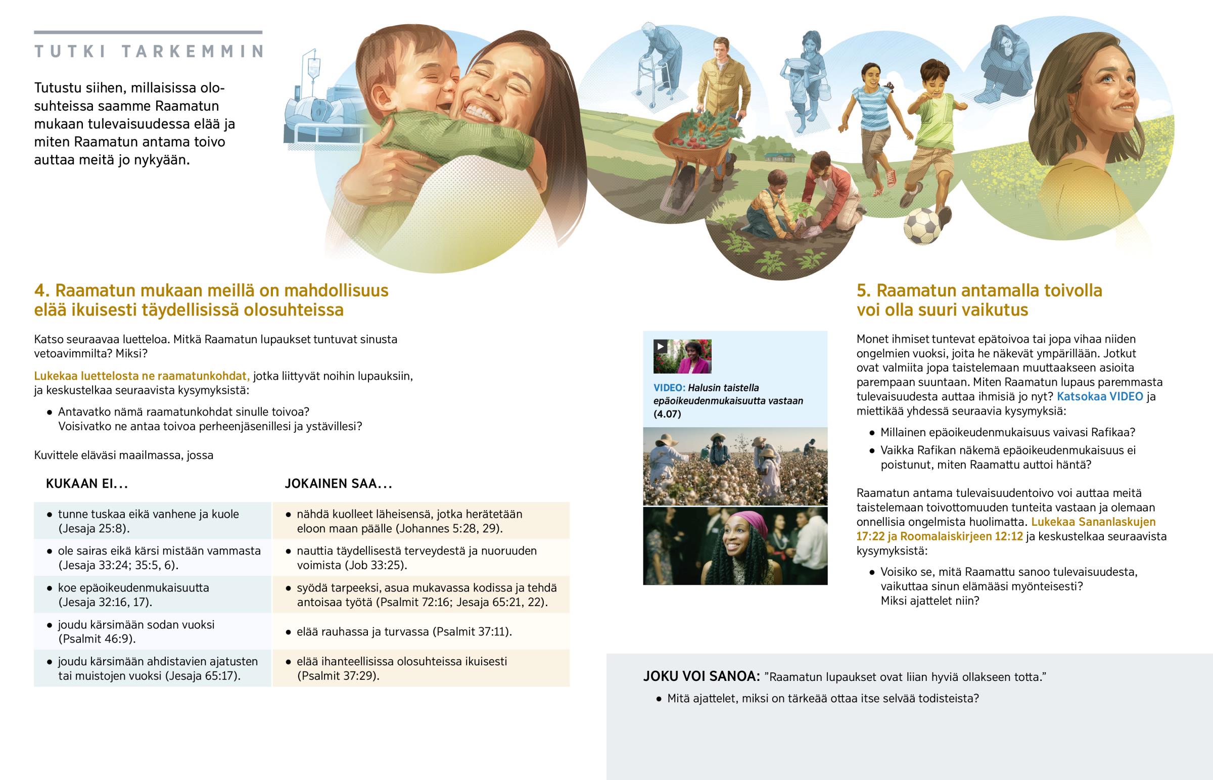 Tutustu siihen, millaisissa olosuhteissa saamme Raamatun mukaan tulevaisuudessa elää ja miten Raamatun antama toivo auttaa meitä jo nykyään.