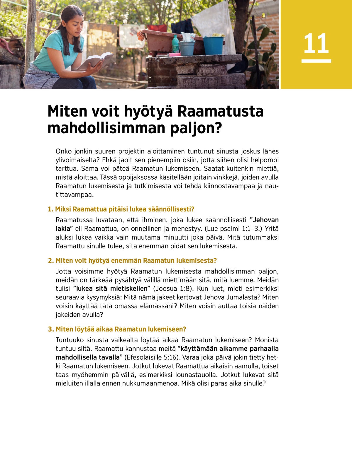 Onko jonkin suuren projektin aloittaminen tuntunut sinusta joskus lähes ylivoimaiselta? Ehkä jaoit sen pienempiin osiin, jotta siihen olisi helpompi tarttua. Sama voi päteä Raamatun lukemiseen. Saatat kuitenkin miettiä, mistä aloittaa. Tässä oppijaksossa käsitellään joitain vinkkejä, joiden avulla Raamatun lukemisesta ja tutkimisesta voi tehdä kiinnostavampaa ja nautittavampaa.