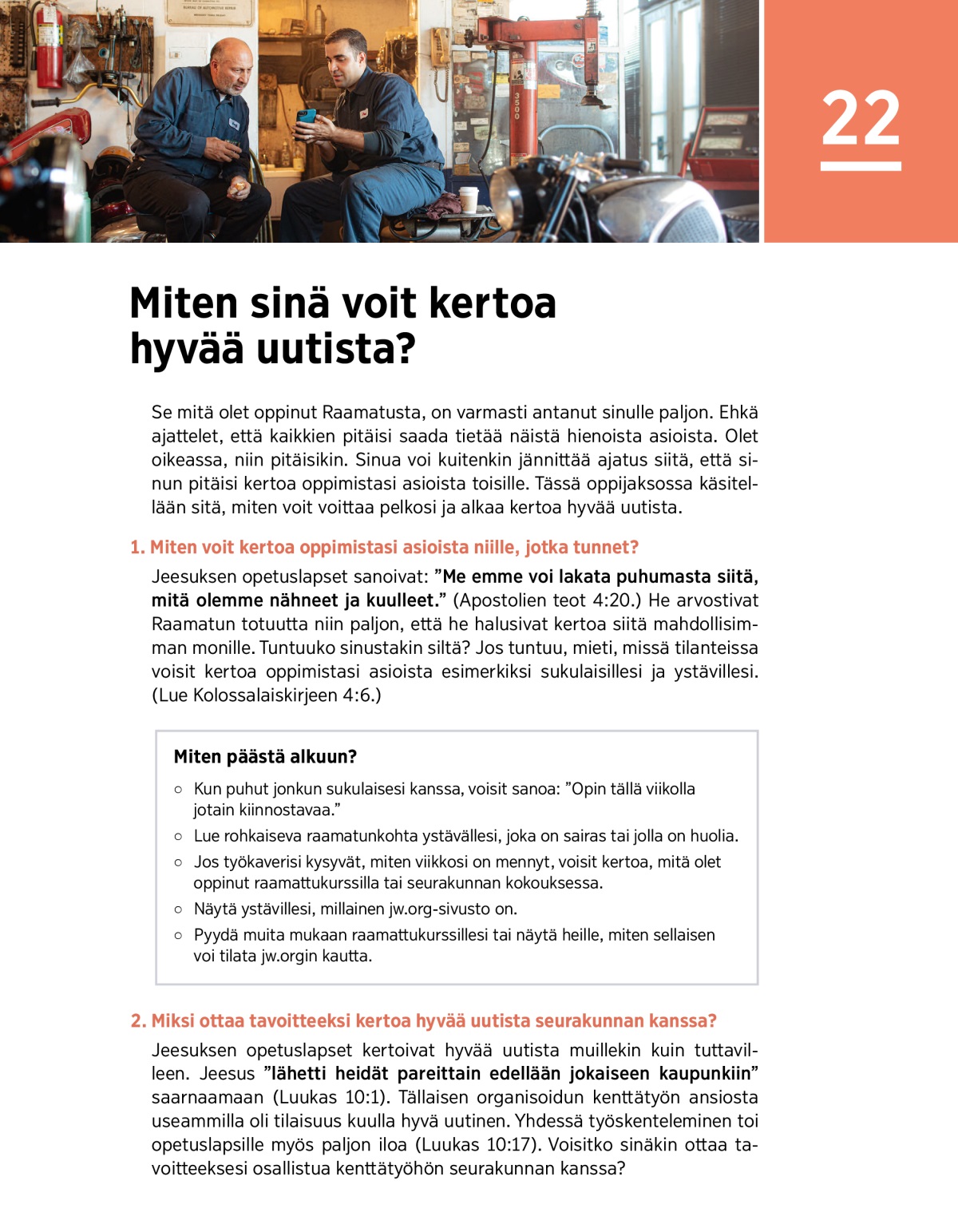 Se mitä olet oppinut Raamatusta, on varmasti antanut sinulle paljon. Ehkä ajattelet, että kaikkien pitäisi saada tietää näistä hienoista asioista. Olet oikeassa, niin pitäisikin. Sinua voi kuitenkin jännittää ajatus siitä, että sinun pitäisi kertoa oppimistasi asioista toisille. Tässä oppijaksossa käsitellään sitä, miten voit voittaa pelkosi ja alkaa kertoa hyvää uutista.