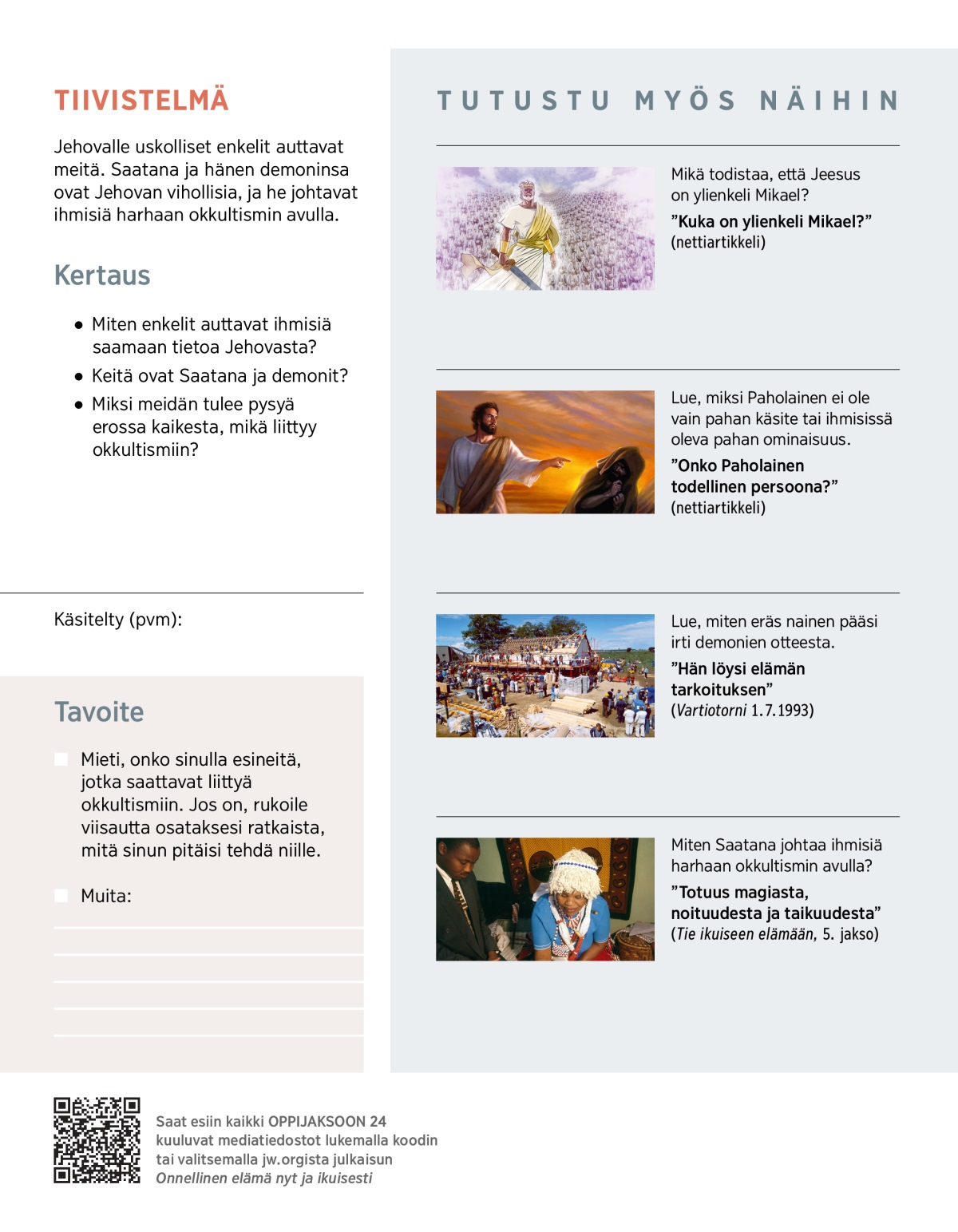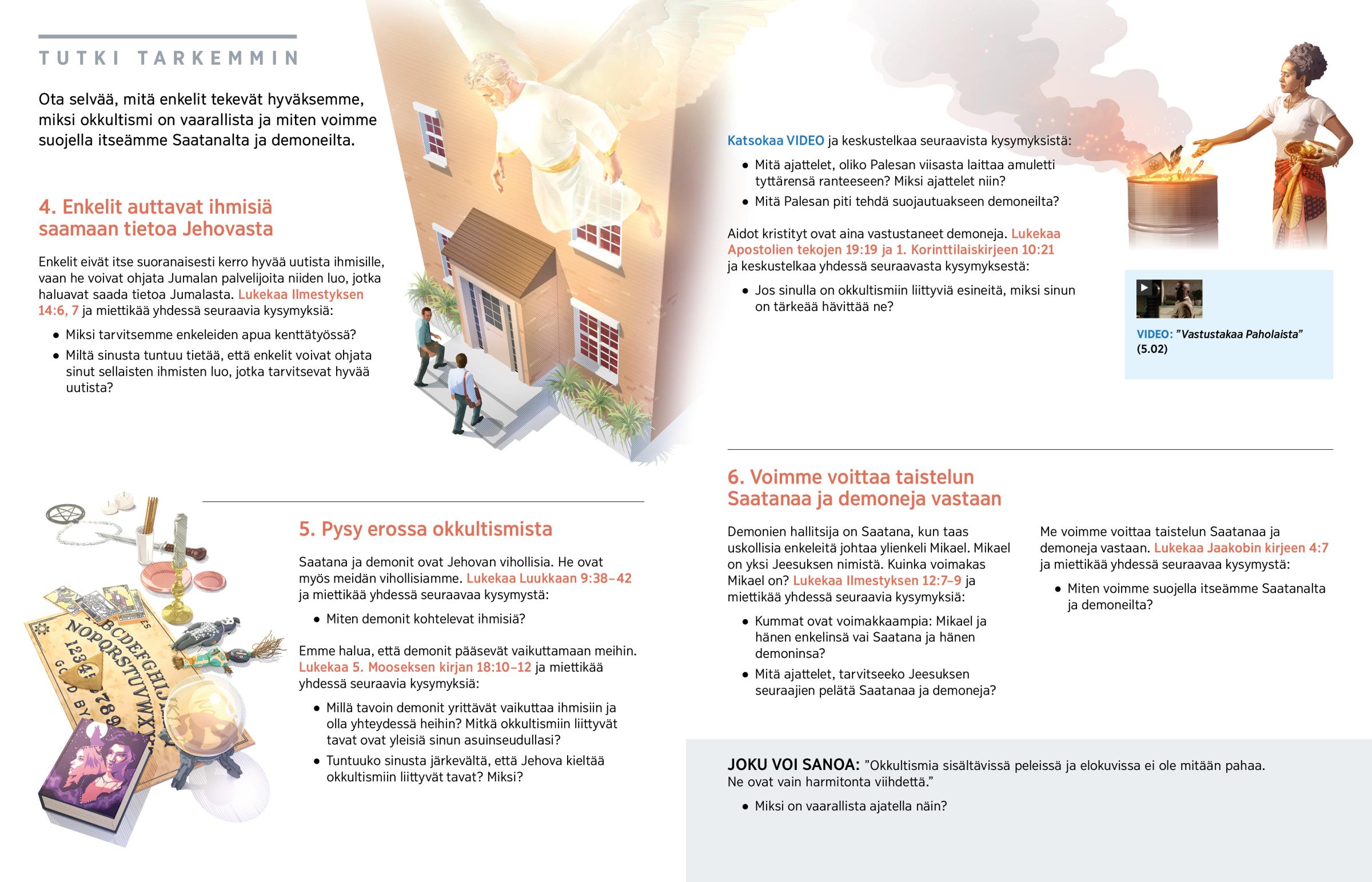 Jehovalle uskolliset enkelit auttavat meitä. Saatana ja hänen demoninsa ovat Jehovan vihollisia, ja he johtavat ihmisiä harhaan okkultismin avulla.