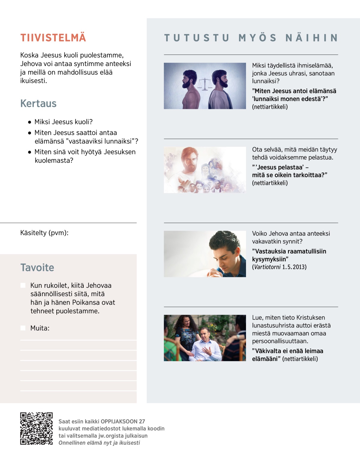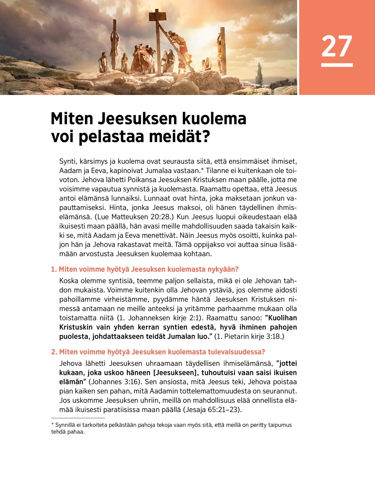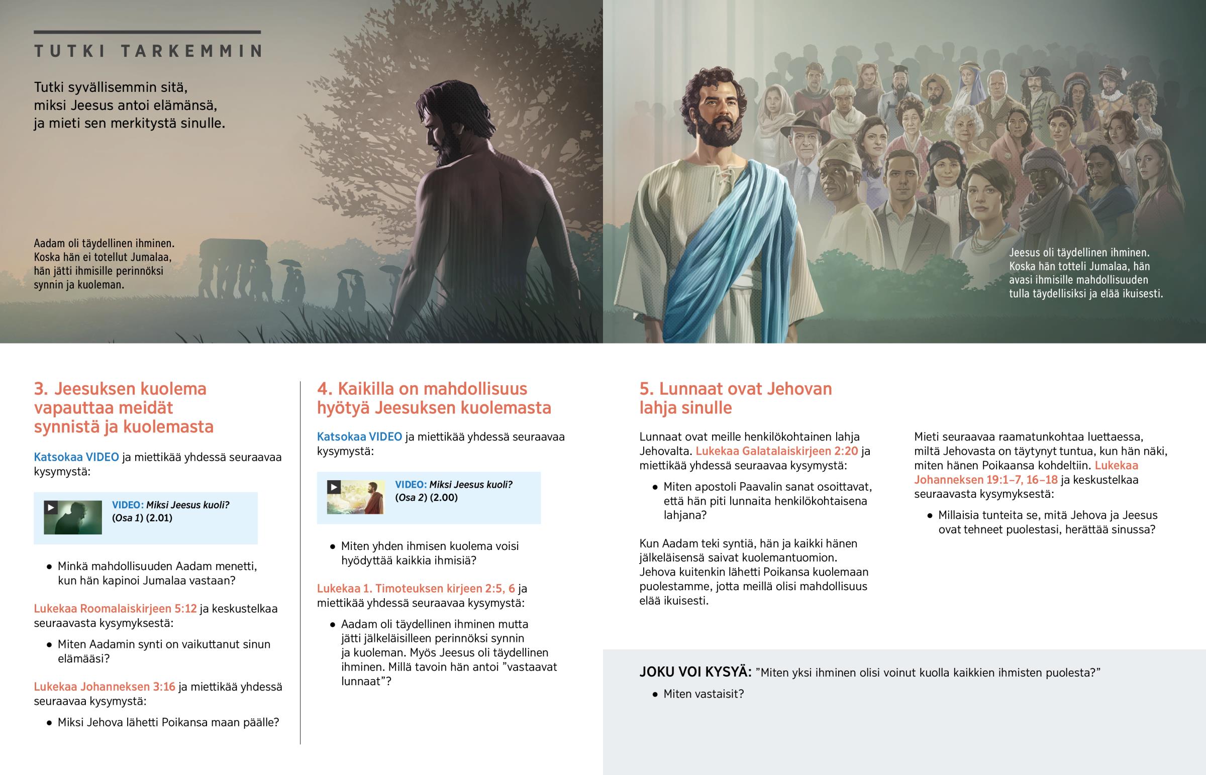 Synti, kärsimys ja kuolema ovat seurausta siitä, että ensimmäiset ihmiset, Aadam ja Eeva, kapinoivat Jumalaa vastaan.a Tilanne ei kuitenkaan ole toivoton. Jehova lähetti Poikansa Jeesuksen Kristuksen maan päälle, jotta me voisimme vapautua synnistä ja kuolemasta. Raamattu opettaa, että Jeesus antoi elämänsä lunnaiksi. Lunnaat ovat hinta, joka maksetaan jonkun vapauttamiseksi. Hinta, jonka Jeesus maksoi, oli hänen täydellinen ihmiselämänsä. (Lue Matteuksen 20:28.) Kun Jeesus luopui oikeudestaan elää ikuisesti maan päällä, hän avasi meille mahdollisuuden saada takaisin kaikki se, mitä Aadam ja Eeva menettivät. Näin Jeesus myös osoitti, kuinka paljon hän ja Jehova rakastavat meitä. Tämä oppijakso voi auttaa sinua lisäämään arvostusta Jeesuksen kuolemaa kohtaan.