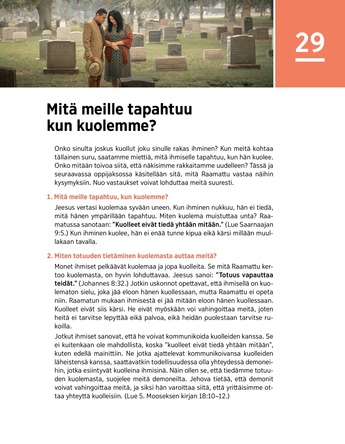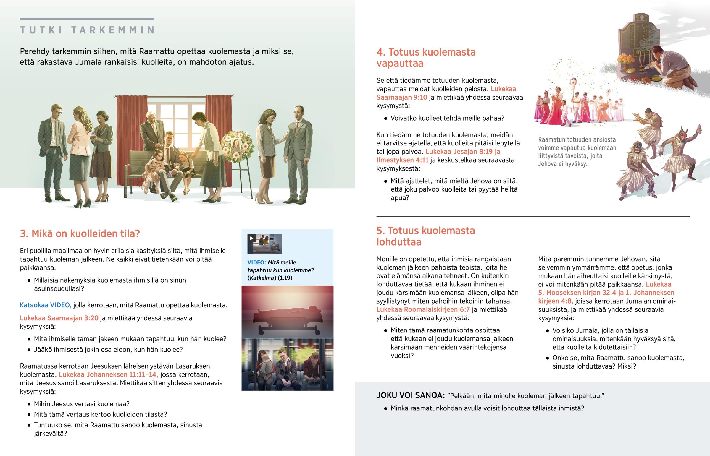 Onko sinulta joskus kuollut joku sinulle rakas ihminen? Kun meitä kohtaa tällainen suru, saatamme miettiä, mitä ihmiselle tapahtuu, kun hän kuolee. Onko mitään toivoa siitä, että näkisimme rakkaitamme uudelleen? Tässä ja seuraavassa oppijaksossa käsitellään sitä, mitä Raamattu vastaa näihin kysymyksiin. Nuo vastaukset voivat lohduttaa meitä suuresti.