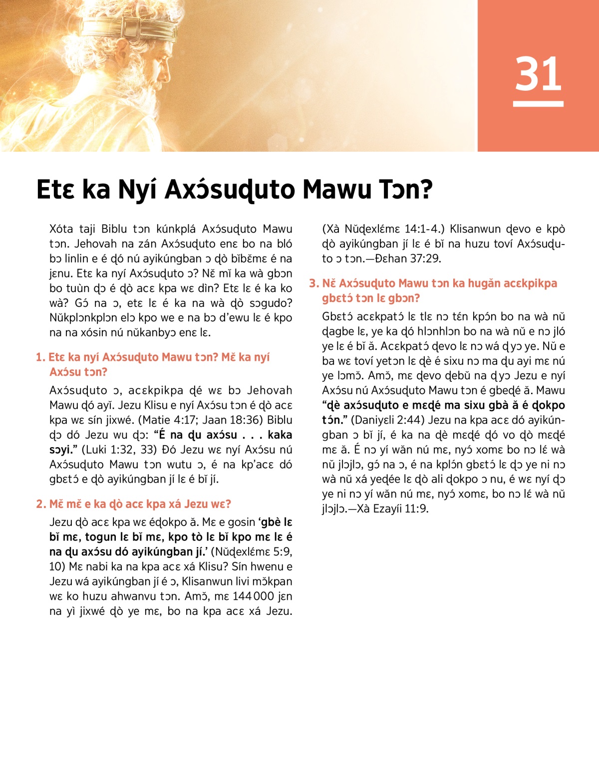 Xóta taji Biblu tɔn kúnkplá Axɔ́suɖuto Mawu tɔn. Jehovah na zán Axɔ́suɖuto enɛ bo na bló bɔ linlin e é ɖó nú ayikúngban ɔ ɖò bǐbɛ̌mɛ é na jɛnu. Etɛ ka nyí Axɔ́suɖuto ɔ? Nɛ̌ mǐ ka wà gbɔn bo tuùn ɖɔ é ɖò acɛ kpa wɛ dìn? Etɛ lɛ é ka ko wà? Gɔ́ na ɔ, etɛ lɛ é ka na wà ɖò sɔgudo? Nǔkplɔnkplɔn elɔ kpo we e na bɔ d’ewu lɛ é kpo na na xósin nú nǔkanbyɔ enɛ lɛ.
