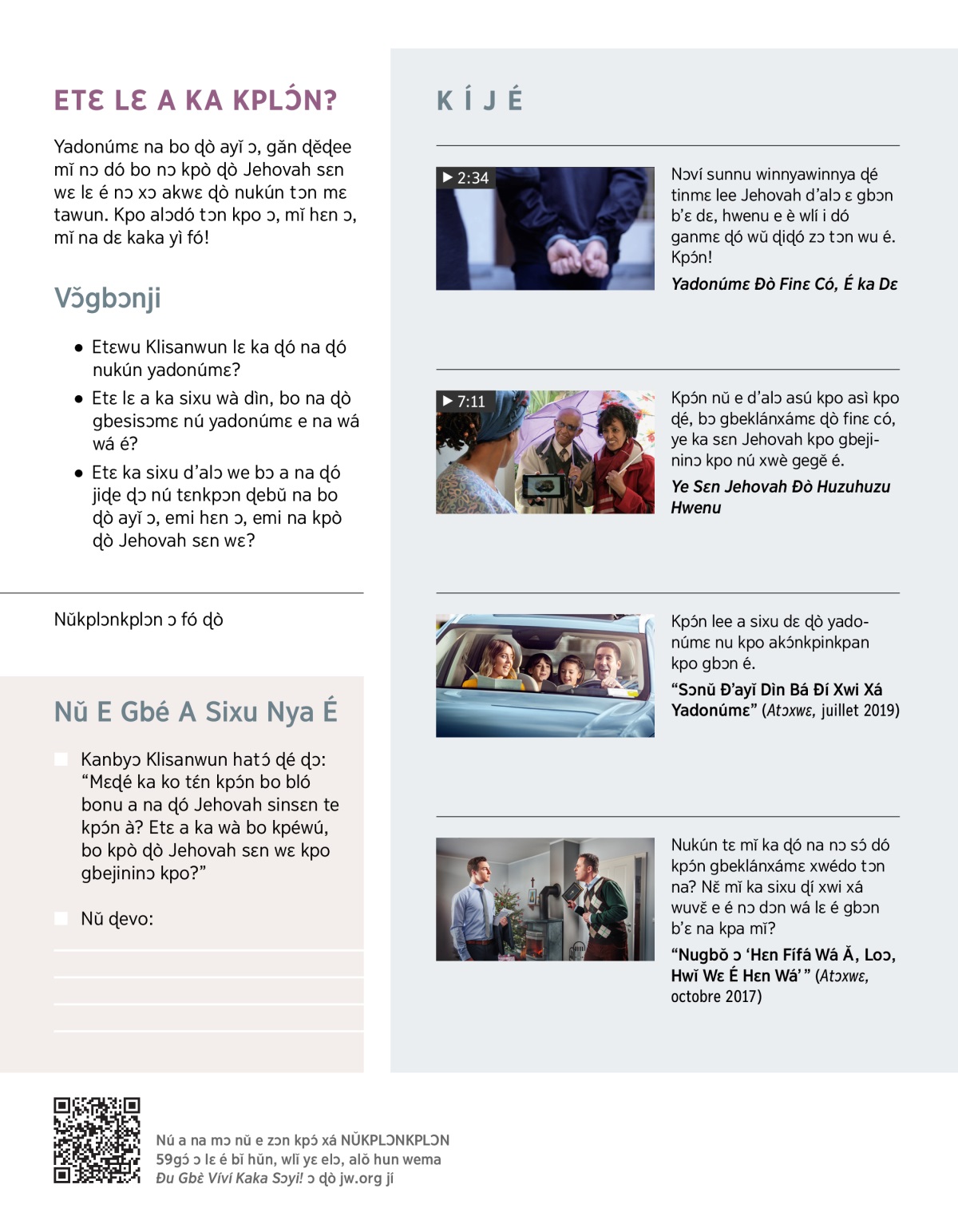 Kúnnuɖetɔ́ Jehovah tɔn e ɖó xwè vovo bo gosin fí vovo lɛ é kpò ɖò Jehovah sɛn wɛ kpo gbejininɔ kpo. Gbeklánxámɛ ɖò finɛ có, nǔ ka nyí mɔ̌. Nú a jló na tuùn nǔ e d’alɔ ye é hǔn, xò VIDEO ɔ. Enɛ gudo hǔn, mi ɖɔ xó ɖó kpɔ́ dó nǔkanbyɔ e bɔ d’ewu é jí.