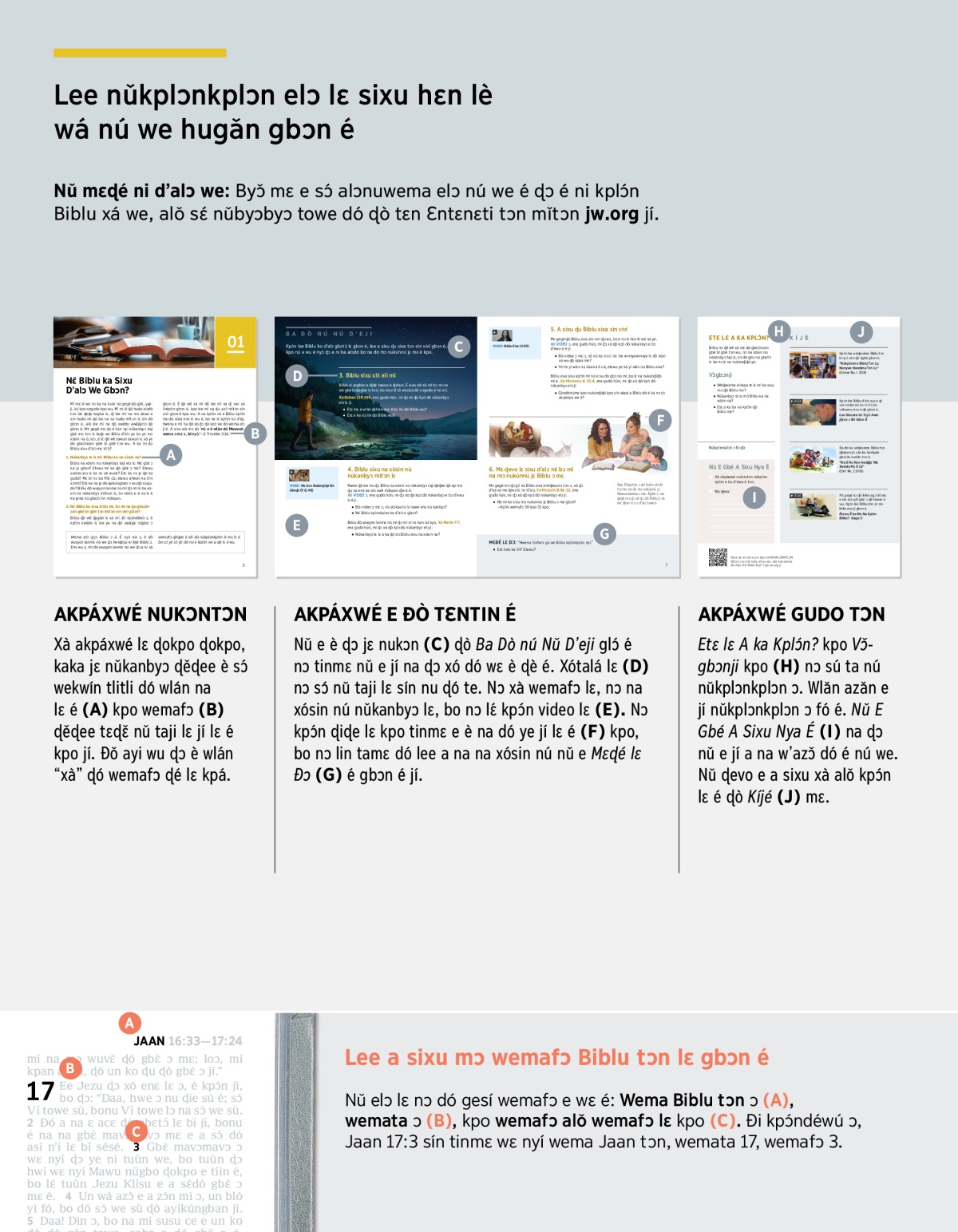 Nǔ mɛɖé ni d’alɔ we: Byɔ̌ mɛ e sɔ́ alɔnuwema elɔ nú we é ɖɔ é ni kplɔ́n Biblu xá we, alǒ sɛ́ nǔbyɔbyɔ towe dó ɖò tɛn Ɛntɛnɛti tɔn mǐtɔn jw.org jí.