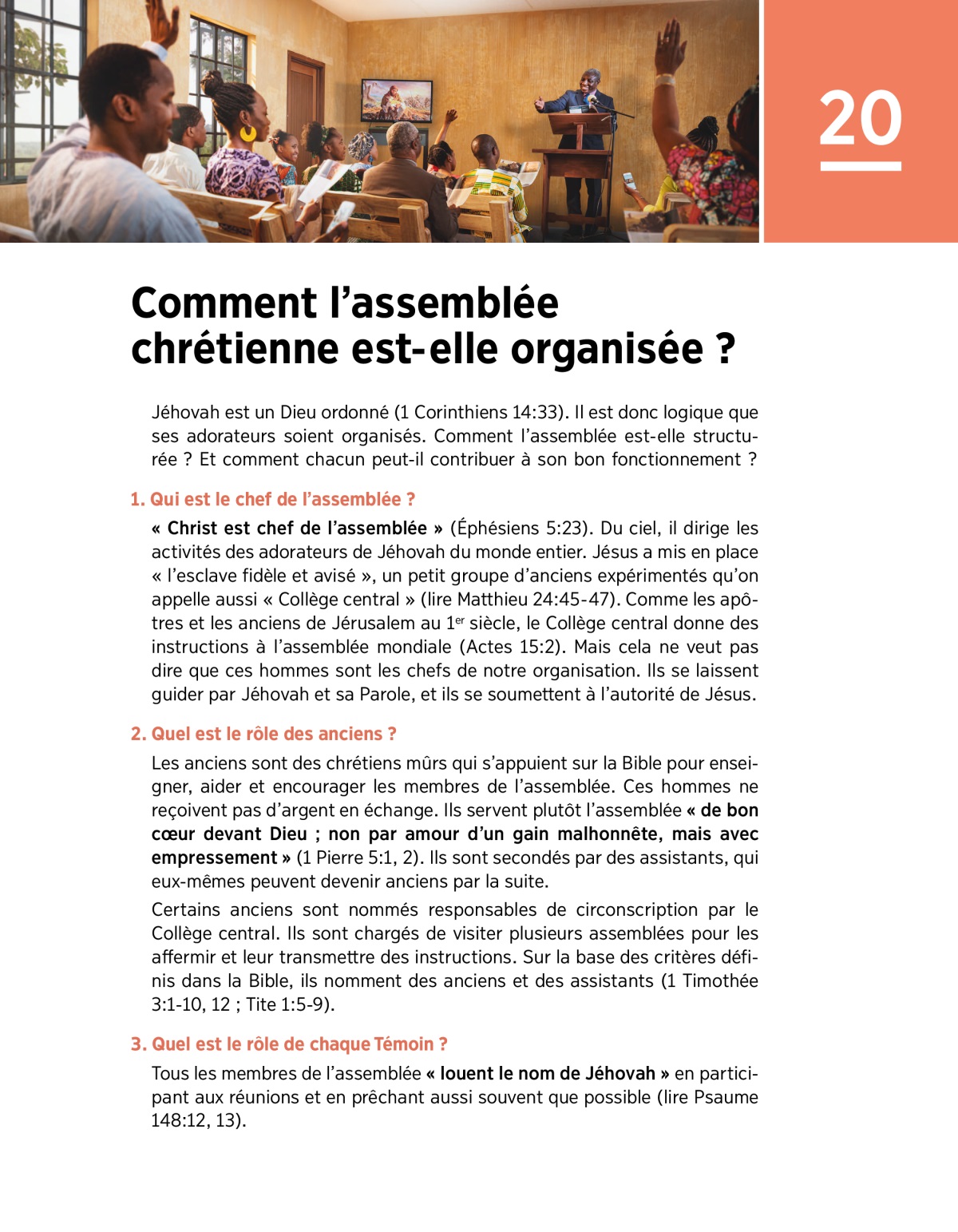 Jéhovah est un Dieu ordonné (1 Corinthiens 14:33). Il est donc logique que ses adorateurs soient organisés. Comment l’assemblée est-elle structurée ? Et comment chacun peut-il contribuer à son bon fonctionnement ?