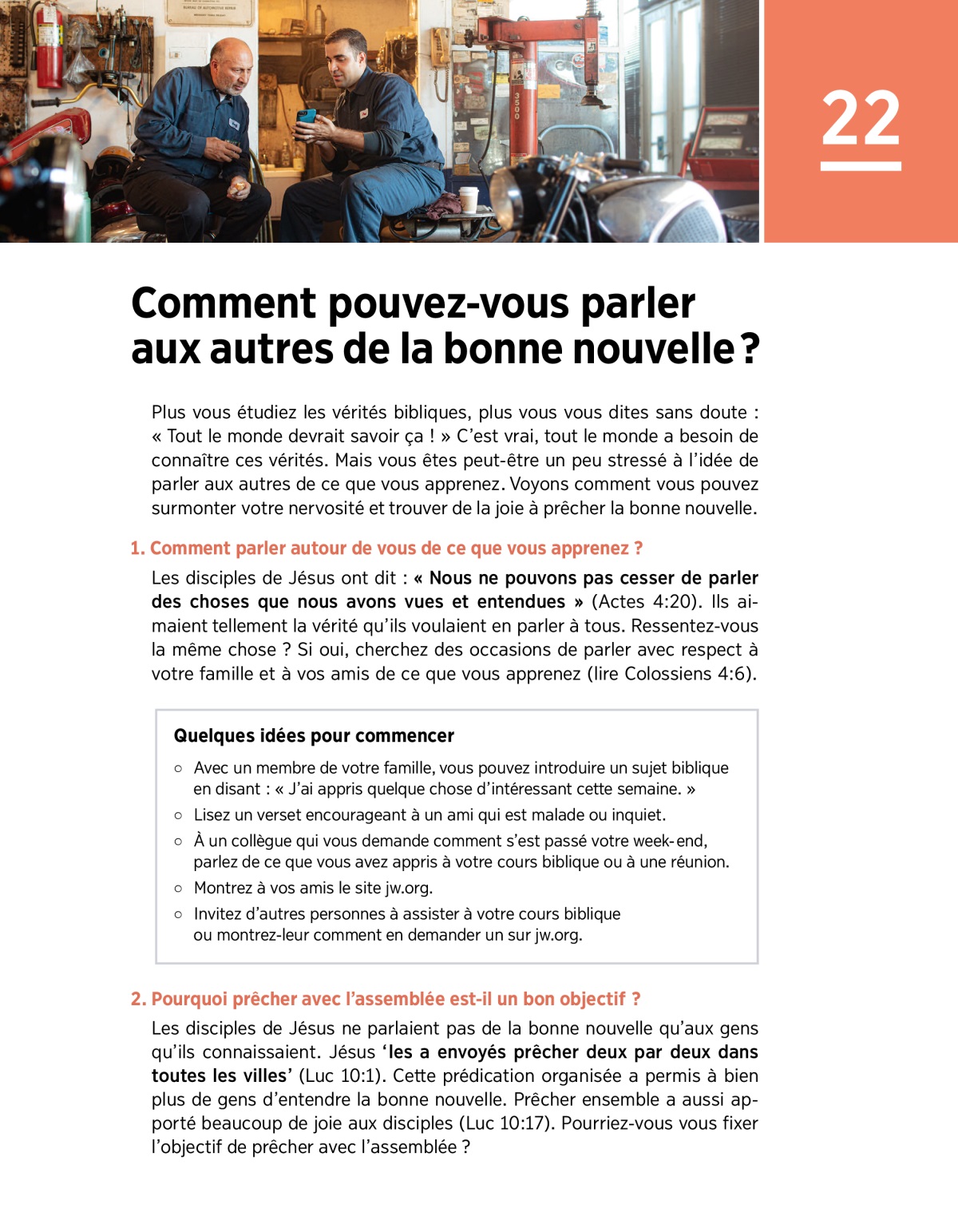 Les disciples de Jésus ont dit : « Nous ne pouvons pas cesser de parler des choses que nous avons vues et entendues » (Actes 4:20). Ils aimaient tellement la vérité qu’ils voulaient en parler à tous. Ressentez-vous la même chose ? Si oui, cherchez des occasions de parler avec respect à votre famille et à vos amis de ce que vous apprenez (lire Colossiens 4:6).