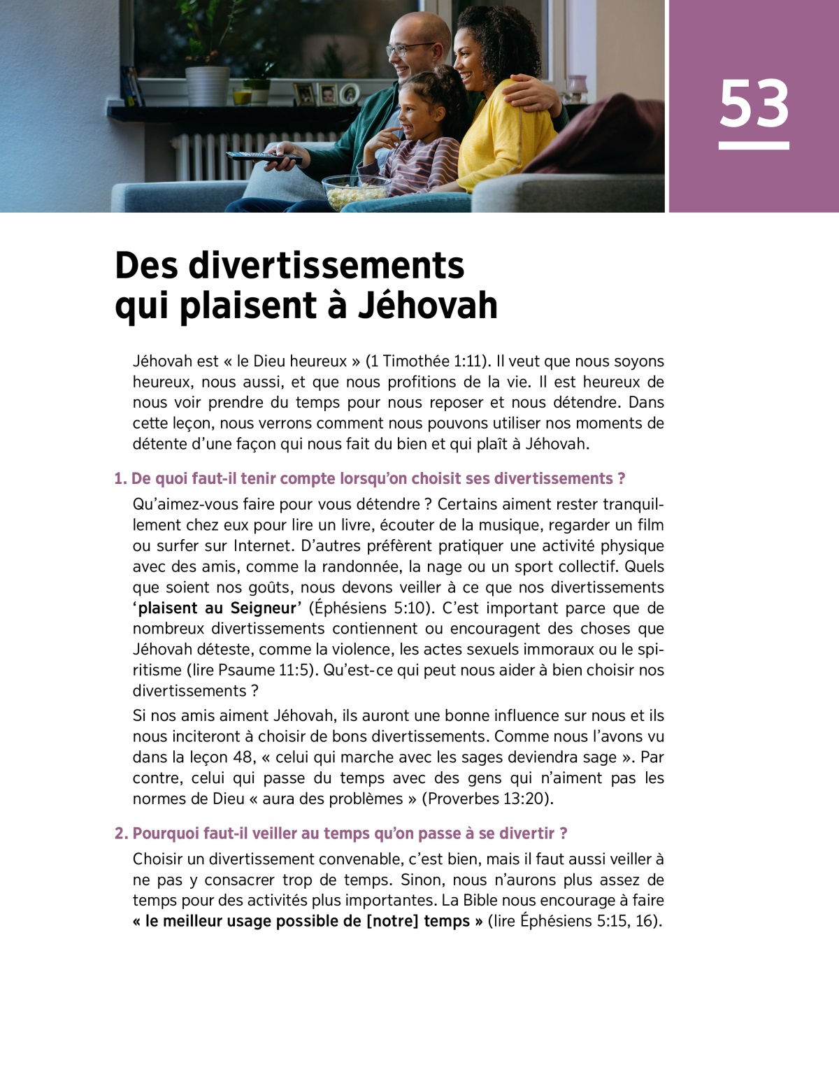 Si nos amis aiment Jéhovah, ils auront une bonne influence sur nous et ils nous inciteront à choisir de bons divertissements. Comme nous l’avons vu dans la leçon 48, « celui qui marche avec les sages deviendra sage ». Par contre, celui qui passe du temps avec des gens qui n’aiment pas les normes de Dieu « aura des problèmes » (Proverbes 13:20).