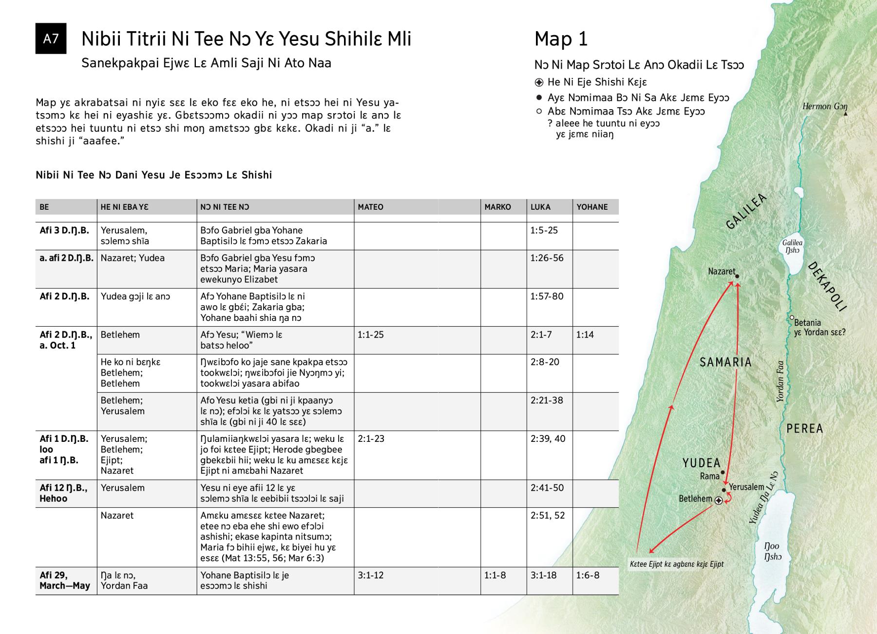 Map yɛ akrabatsai ni nyiɛ sɛɛ lɛ eko fɛɛ eko he, ni etsɔɔ hei ni Yesu yatsɔmɔ kɛ hei ni eyashiɛ yɛ. Gbɛtsɔɔmɔ okadii ni yɔɔ map srɔtoi lɛ anɔ lɛ etsɔɔɔ hei tuuntu ni etsɔ shi moŋ amɛtsɔɔ gbɛ kɛkɛ. Okadi ni ji “a.” lɛ shishi ji “aaafee.”