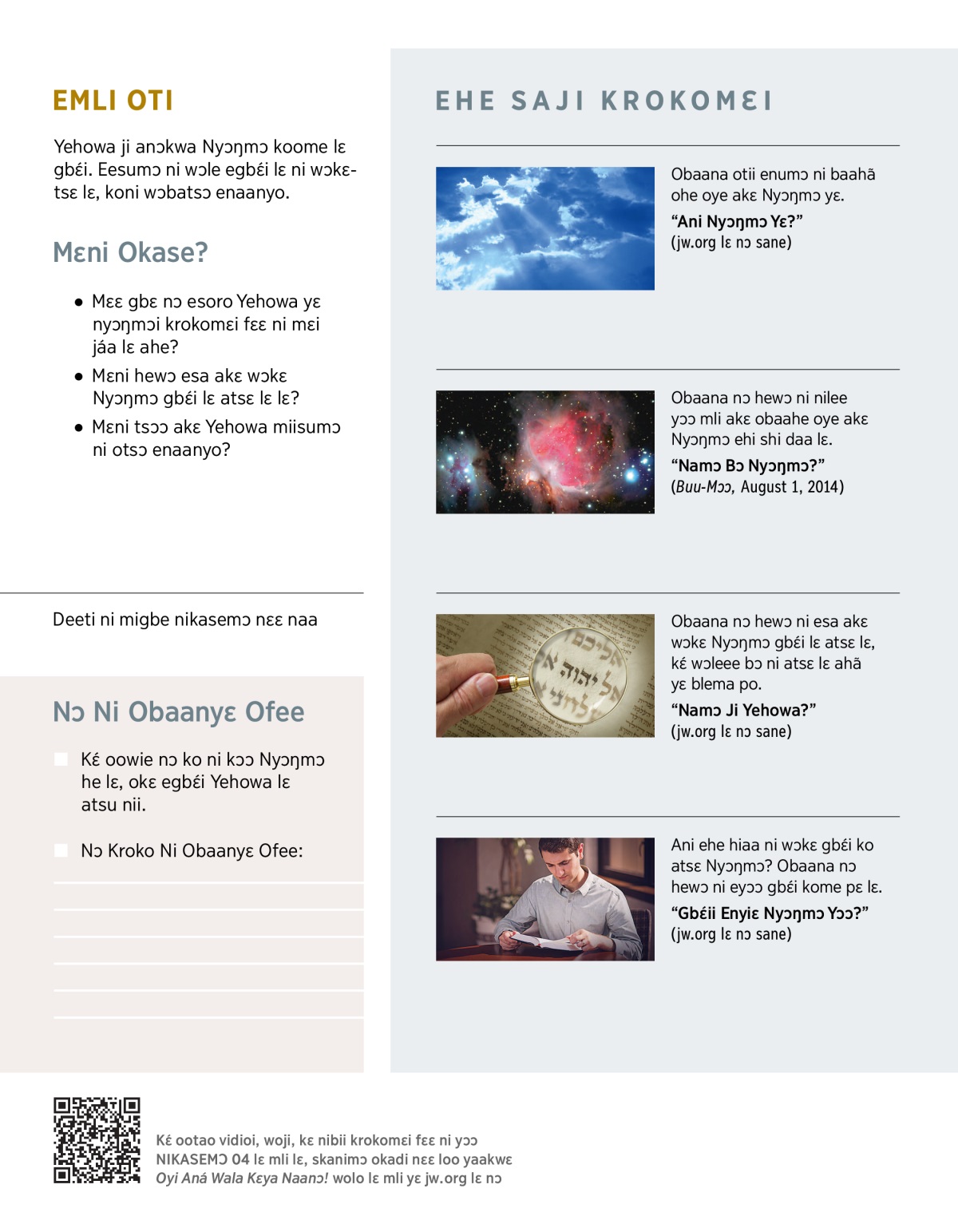 a Kɛ́ ootao ole saji krokomɛi ni kɔɔ Nyɔŋmɔ gbɛ́i lɛ shishinumɔ lɛ he, kɛ nɔ hewɔ ni gbɛ́i nɛɛ bɛ Biblia shishitsɔɔmɔi komɛi amli lɛ, ofainɛ, kwɛmɔ Saji Krokomɛi A4 ni yɔɔ Ŋmalɛ Krɔŋkrɔŋ Lɛ—Jeŋ Hee Shishitsɔɔmɔ lɛ mli lɛ.