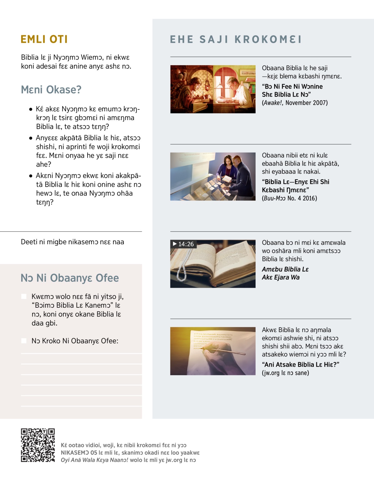 Yehowa eke wɔ nɔ ko ni nɔ bɛ—no ji, Biblia lɛ. Woji 66 yɔɔ Biblia lɛ mli. Shi ekolɛ obaabi ohe akɛ: ‘Te fee tɛŋŋ ni aná Biblia lɛ? Namɔ ŋɔɔ ejɛ?’ Bɔ ni afee ni wɔná sanebimɔi nɛɛ ahetoo lɛ, hã wɔsusu bɔ ni fee ni wɔnine shɛ Nyɔŋmɔ Wiemɔ lɛ, ni ji Biblia lɛ, nɔ lɛ he.