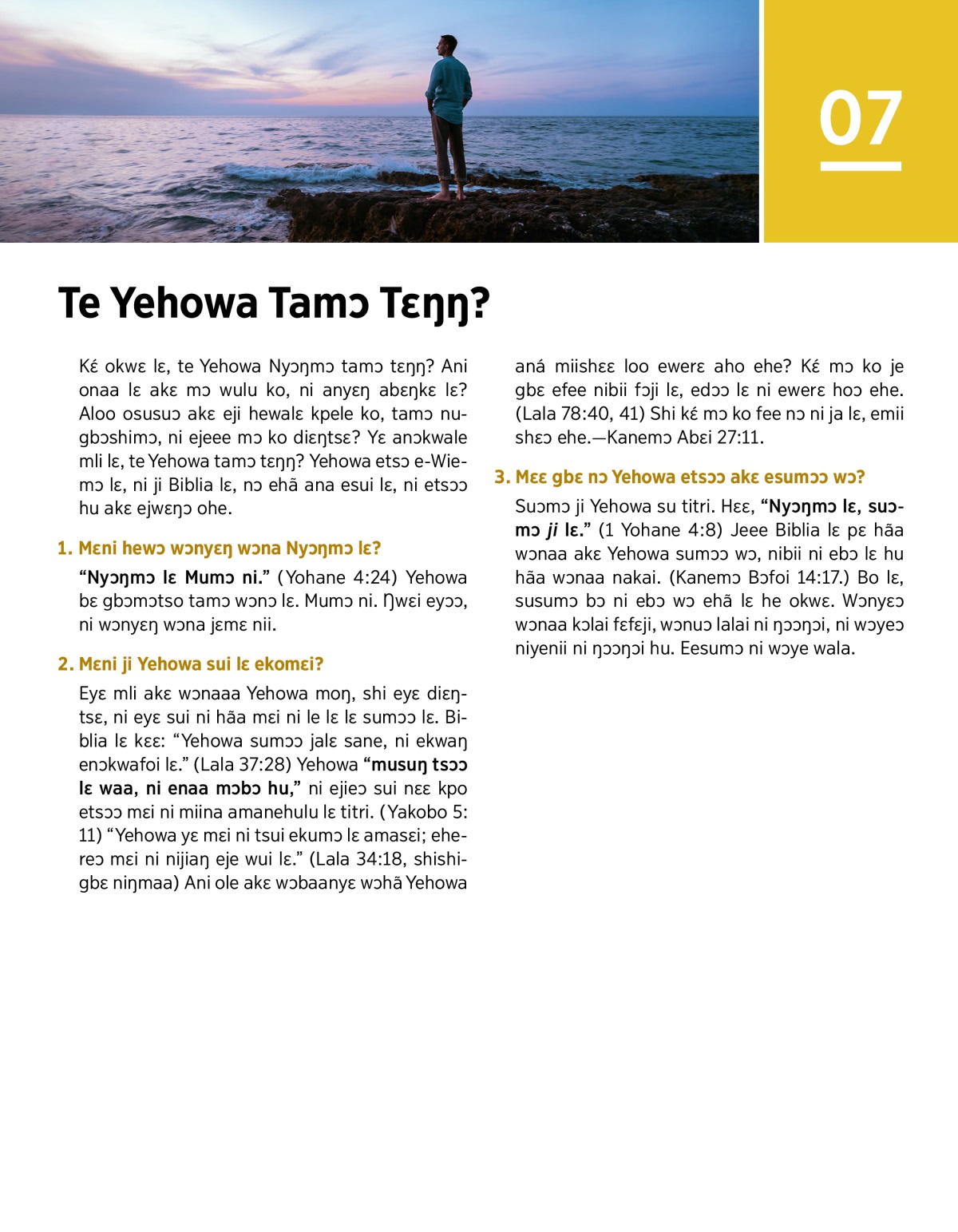 Kɛ́ okwɛ lɛ, te Yehowa Nyɔŋmɔ tamɔ tɛŋŋ? Ani onaa lɛ akɛ mɔ wulu ko, ni anyɛŋ abɛŋkɛ lɛ? Aloo osusuɔ akɛ eji hewalɛ kpele ko, tamɔ nugbɔshimɔ, ni ejeee mɔ ko diɛŋtsɛ? Yɛ anɔkwale mli lɛ, te Yehowa tamɔ tɛŋŋ? Yehowa etsɔ e-Wiemɔ lɛ, ni ji Biblia lɛ, nɔ ehã ana esui lɛ, ni etsɔɔ hu akɛ ejwɛŋɔ ohe.