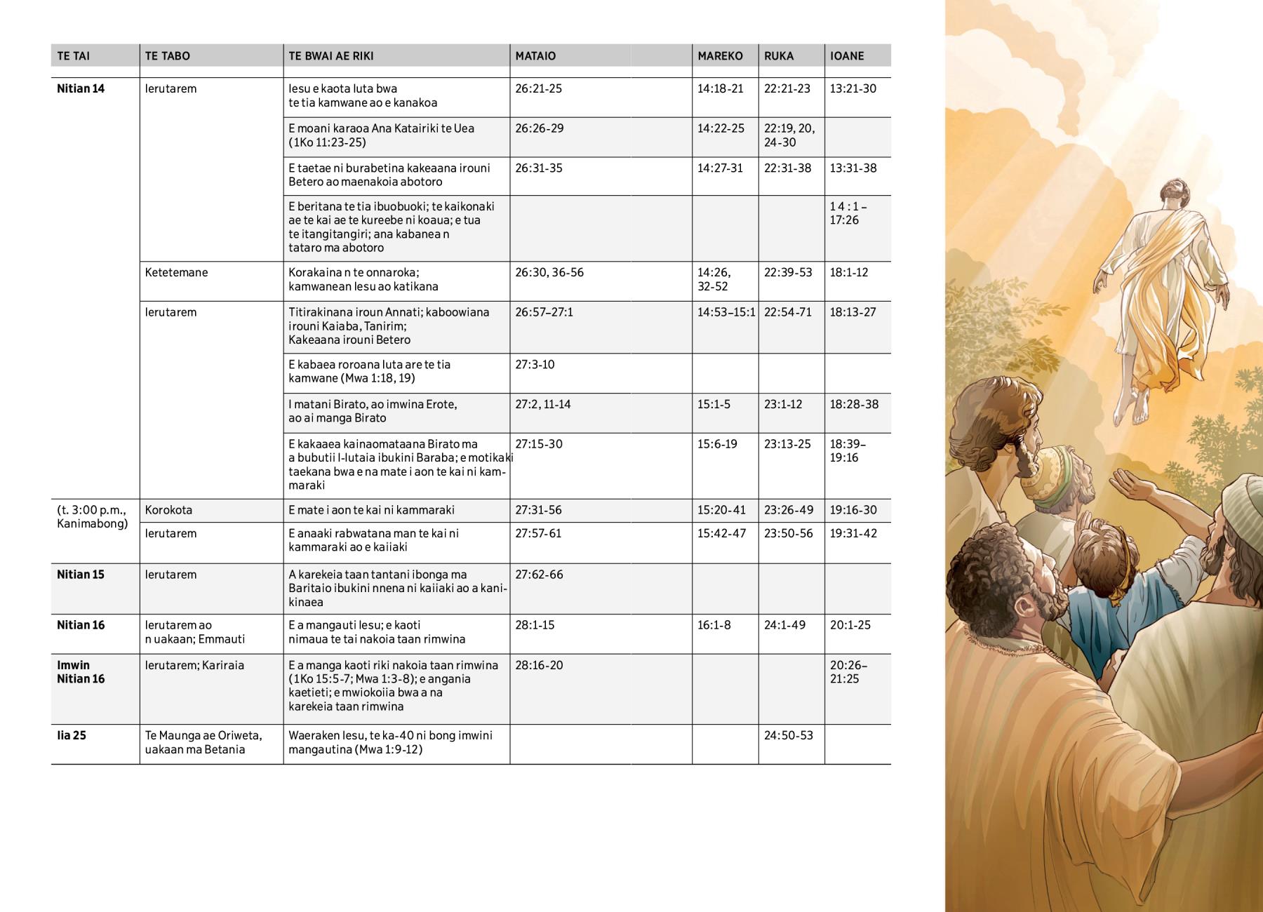 E a manga kaoti riki nakoia taan rimwina (1Ko 15:5-7; Mwa 1:3-8); e angania kaetieti; e mwiokoiia bwa a na karekeia taan rimwina |