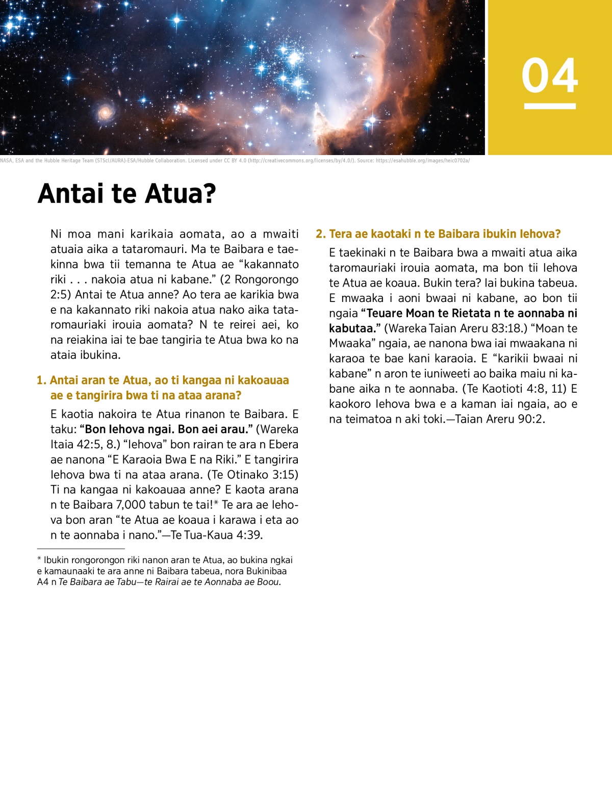 a Ibukin rongorongon riki nanon aran te Atua, ao bukina ngkai e kamaunaaki te ara anne ni Baibara tabeua, nora Bukinibaa A4 n Te Baibara ae Tabu—te Rairai ae te Aonnaba ae Boou.