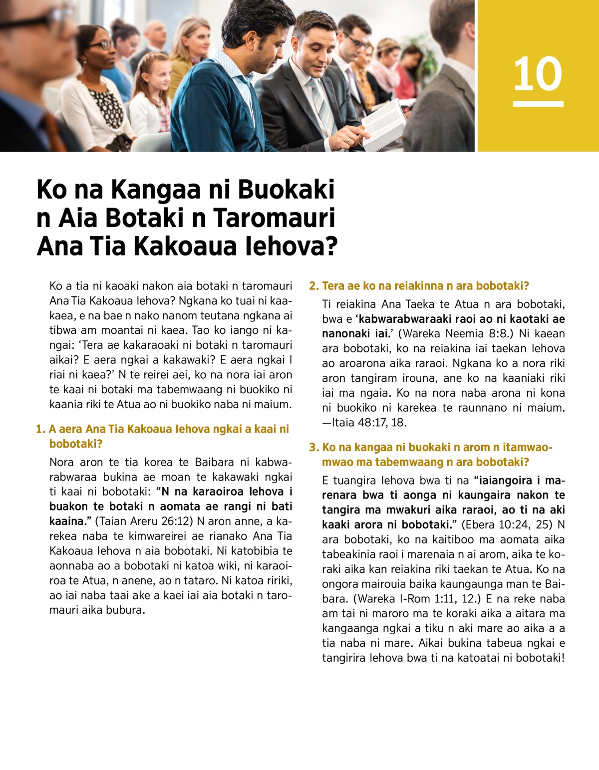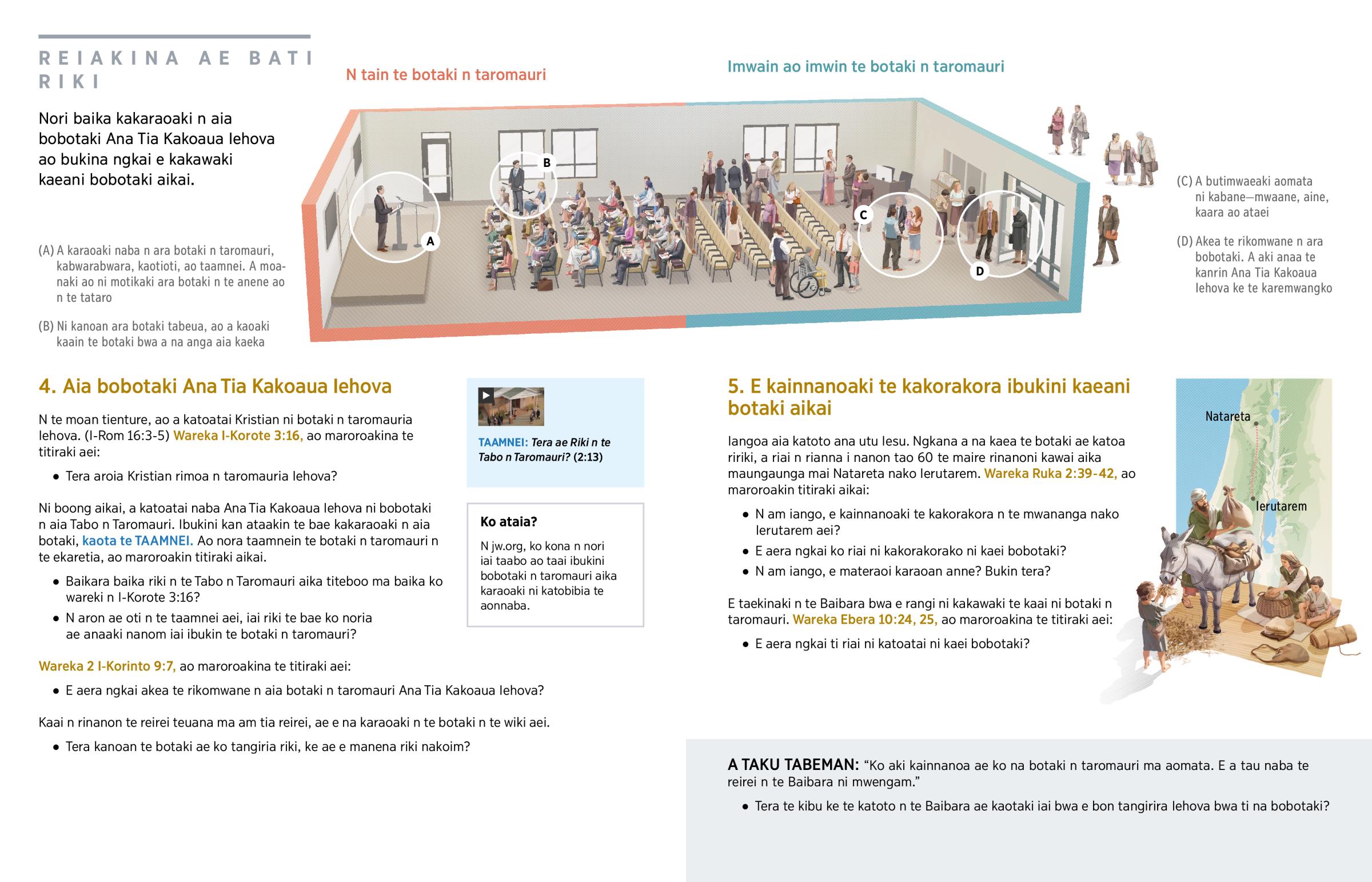 E tuangira Iehova bwa ti na “iaiangoira i marenara bwa ti aonga ni kaungaira nakon te tangira ma mwakuri aika raraoi, ao ti na aki kaaki arora ni bobotaki.” (Ebera 10:24, 25) N ara bobotaki, ko na kaitiboo ma aomata aika tabeakinia raoi i marenaia n ai arom, aika te koraki aika kan reiakina riki taekan te Atua. Ko na ongora mairouia baika kaungaunga man te Baibara. (Wareka I-Rom 1:11, 12.) E na reke naba am tai ni maroro ma te koraki aika a aitara ma kangaanga ngkai a tiku n aki mare ao aika a a tia naba ni mare. Aikai bukina tabeua ngkai e tangirira Iehova bwa ti na katoatai ni bobotaki!