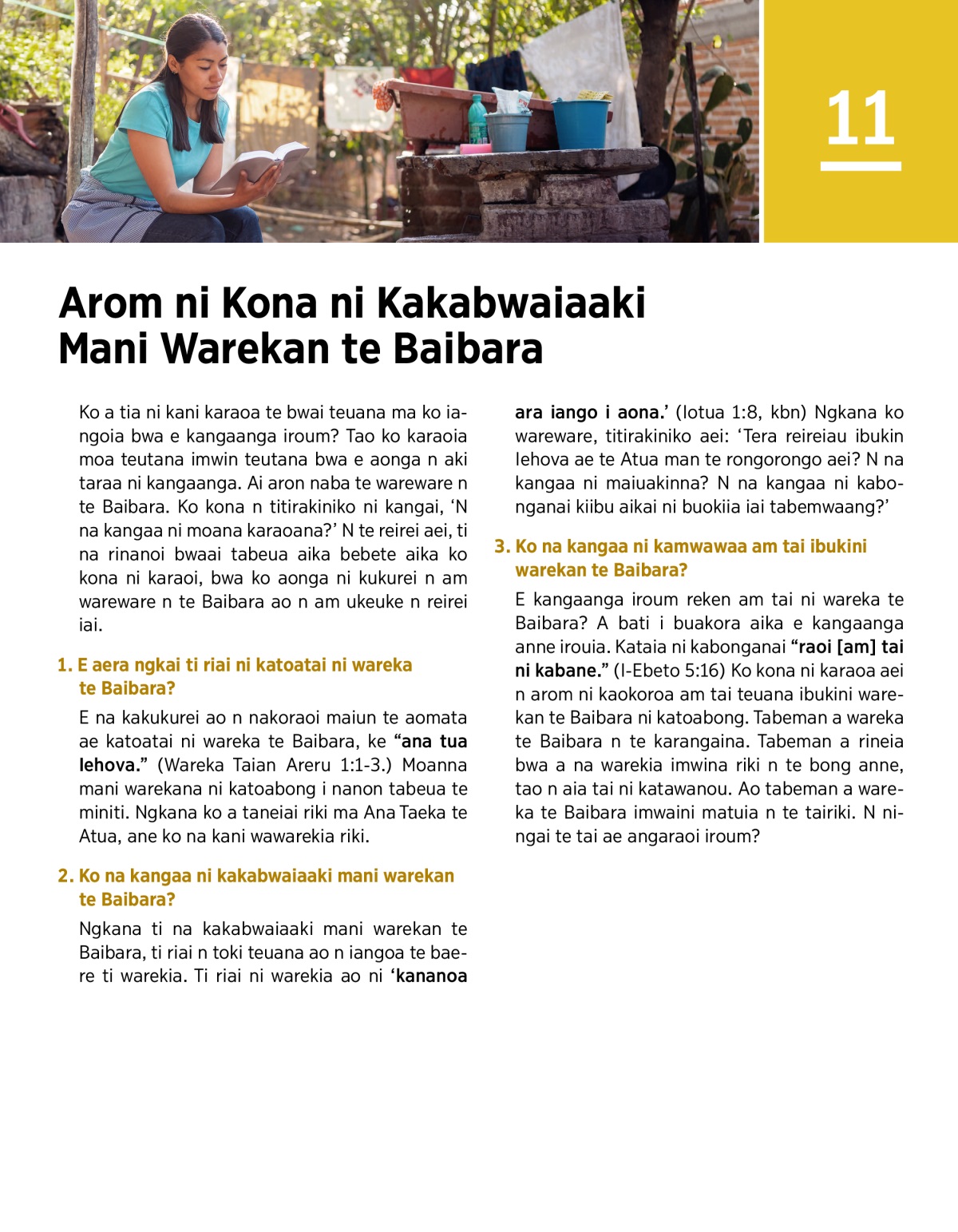 Ngkana ti na kakabwaiaaki mani warekan te Baibara, ti riai n toki teuana ao n iangoa te baere ti warekia. Ti riai ni warekia ao ni ‘kananoa ara iango i aona.’ (Iotua 1:8, kbn) Ngkana ko wareware, titirakiniko aei: ‘Tera reireiau ibukin Iehova ae te Atua man te rongorongo aei? N na kangaa ni maiuakinna? N na kangaa ni kabonganai kiibu aikai ni buokiia iai tabemwaang?’
