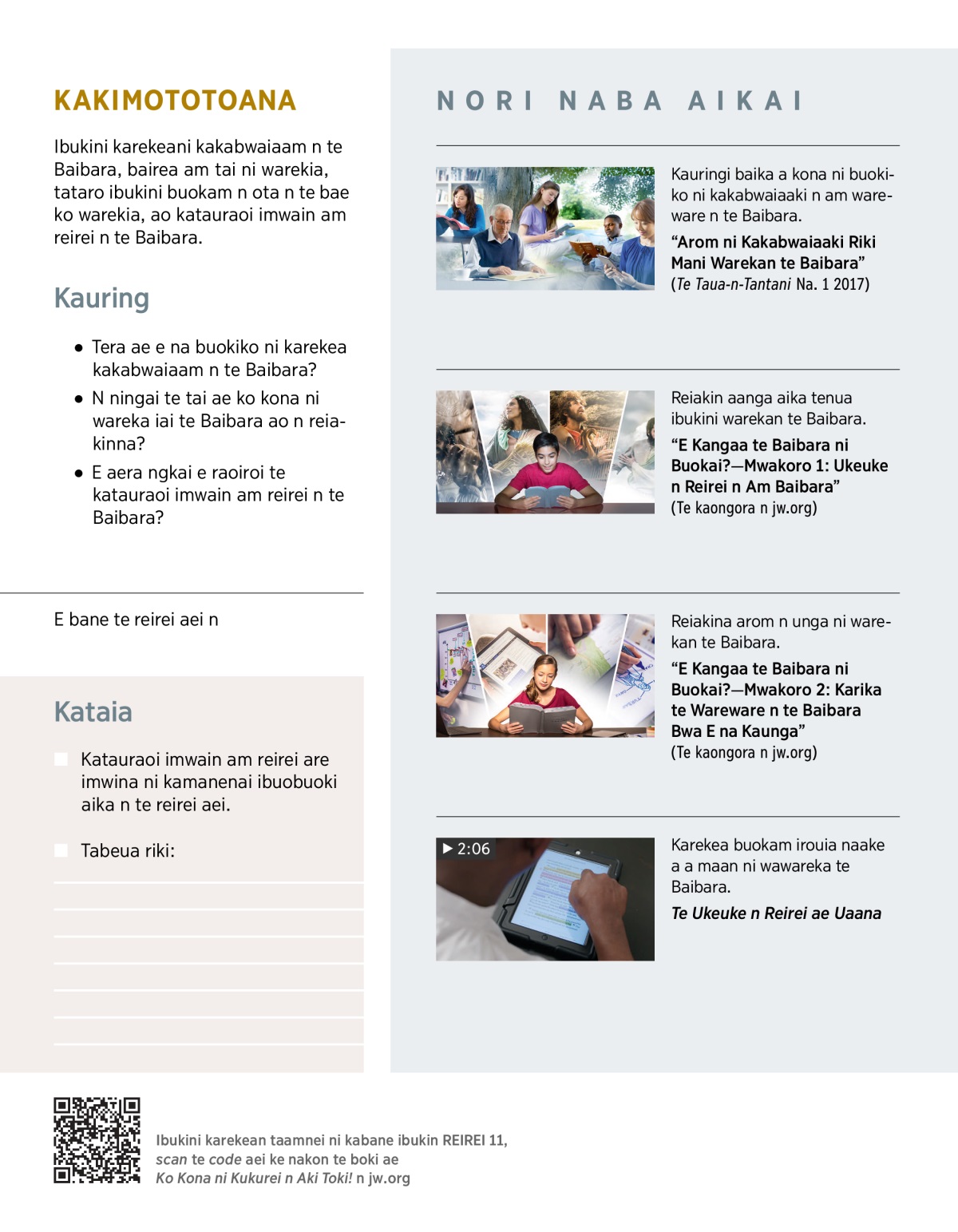 “E Kangaa te Baibara ni Buokai?—Mwakoro 1: Ukeuke n Reirei n Am Baibara” (Te kaongora n jw.org)