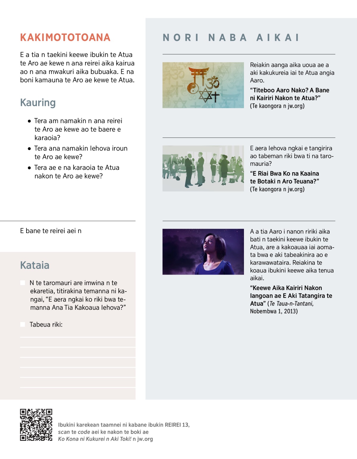 “Titeboo Aaro Nako? A Bane ni Kairiri Nakon te Atua?” (Te kaongora n jw.org)