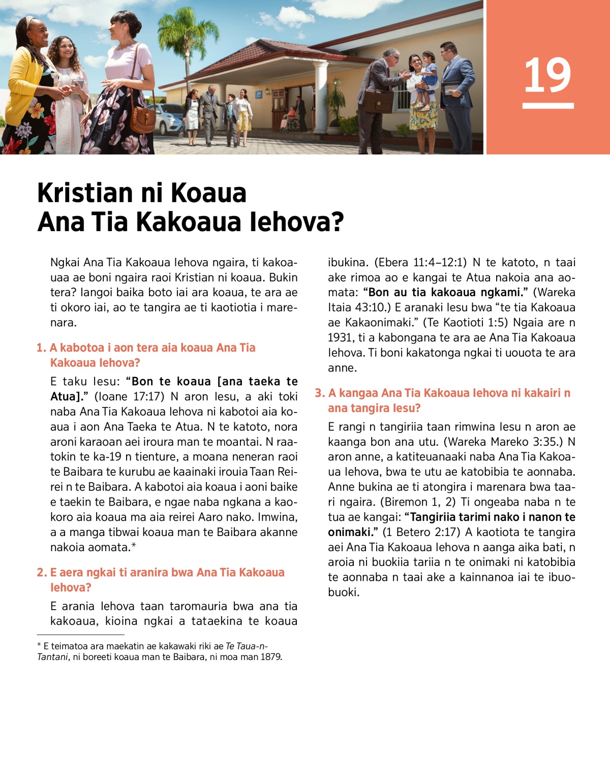 Boni Kristian ni koaua Ana Tia Kakoaua Iehova. Bon te utu ngaira ae katobibia te aonnaba aika taan taromauria te Atua, ao ti kabotoi ara koaua i aon te Baibara, ao ti kaotiota te koaua ibukin Iehova.