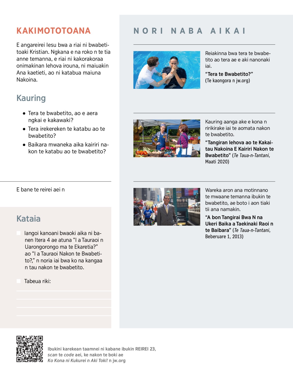 E angareirei Iesu bwa a riai ni bwabetitoaki Kristian. (Wareka Mataio 28:19, 20.) Ma tera te bwabetito? Ao tera ae e na karaoia te aomata bwa e aonga n roko n te tia anne?
