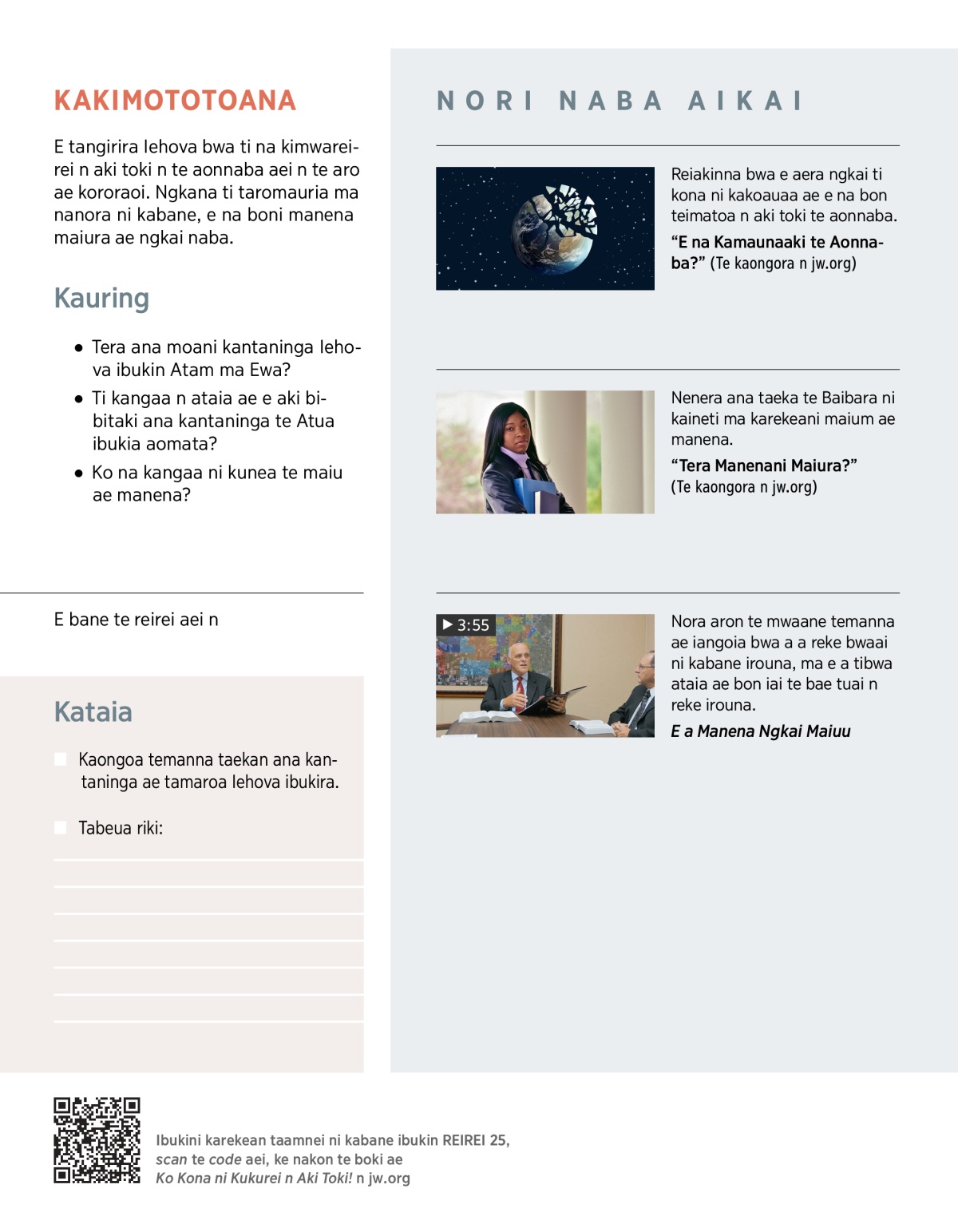 Nora aron ana tangira ae bati Iehova ngke e katauraoa te aonnaba aei ibukira, ao te bae taekinaki n ana Taeka ibukini manenan te maiu aei.