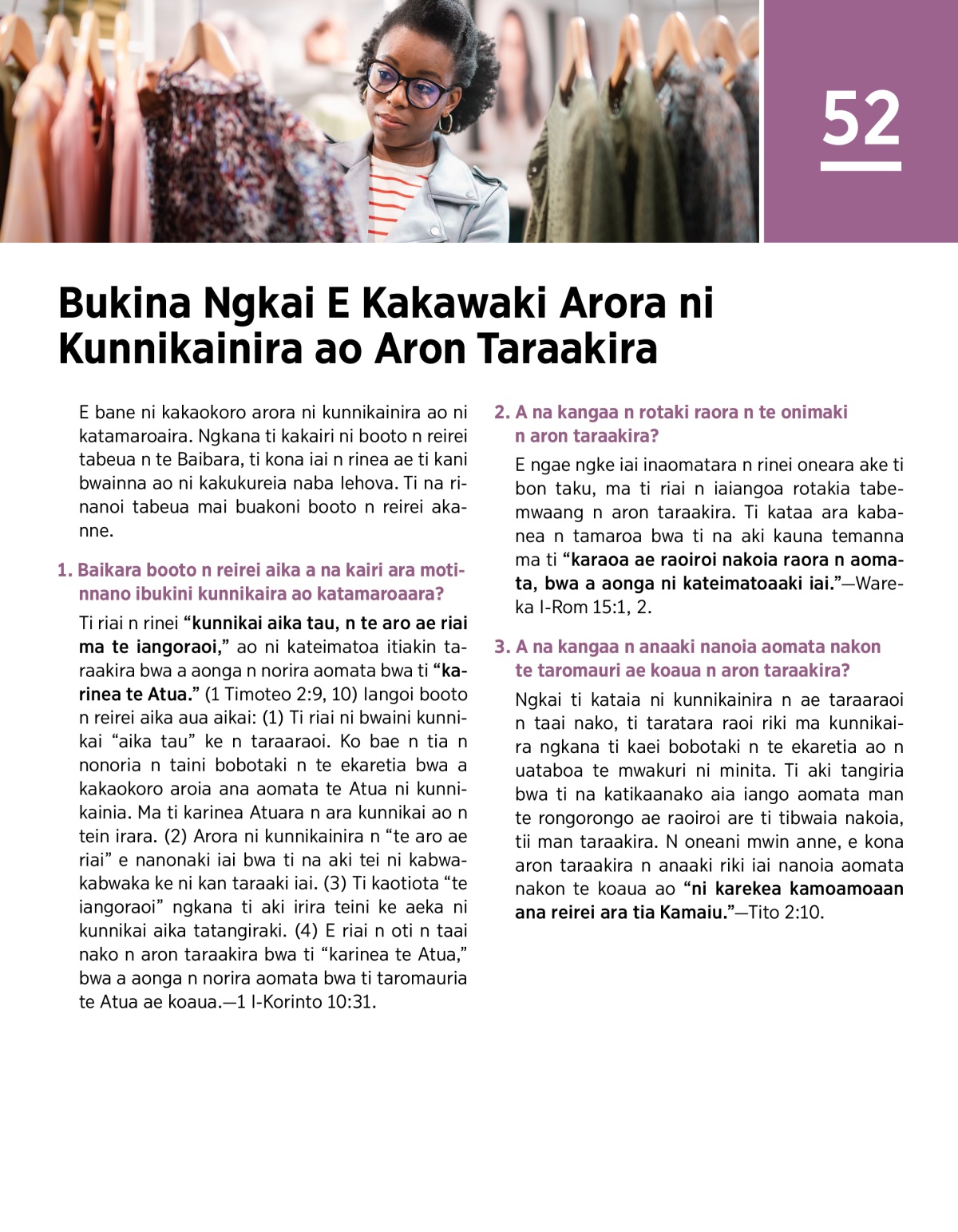E ngae ngkana a bobuaka ara kunnikai ke a aki, ma a riai n itiaki ao n taraaraoi ibukini botaki ake ti iri. Wareka 1 I-Korinto 10:24 ao 1 Timoteo 2:9, 10. Ao maroroakinna bwa e aera ngkai ti riai n rarawa ni bwaini kunnikai aika . . .