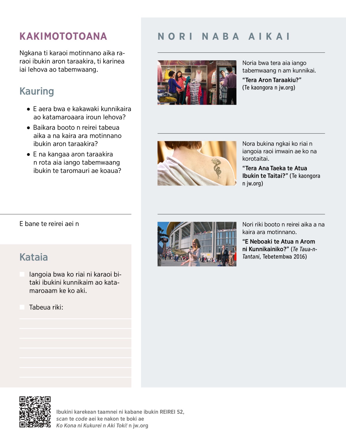 “Tera Ana Taeka te Atua Ibukin te Taitai?” (Te kaongora n jw.org)