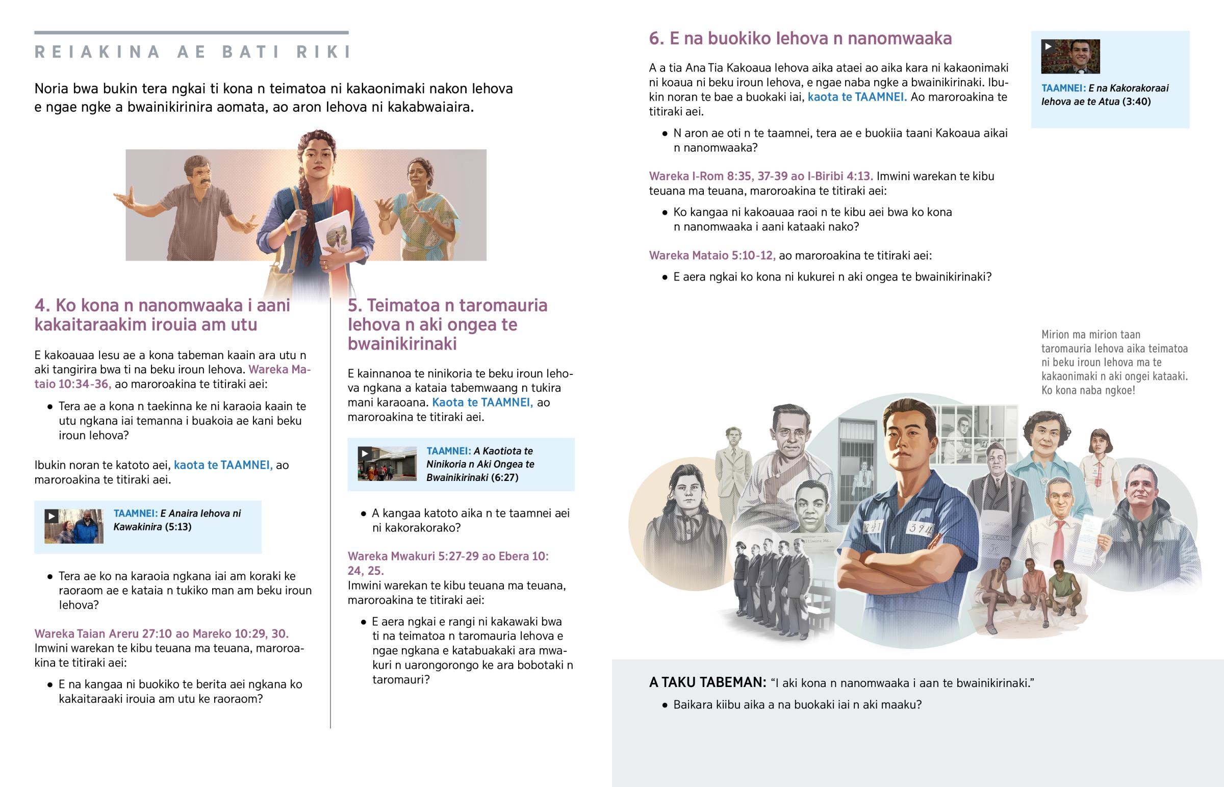 Wareka Mwakuri 5:27-29 ao Ebera 10:24, 25. Imwini warekan te kibu teuana ma teuana, maroroakina te titiraki aei: